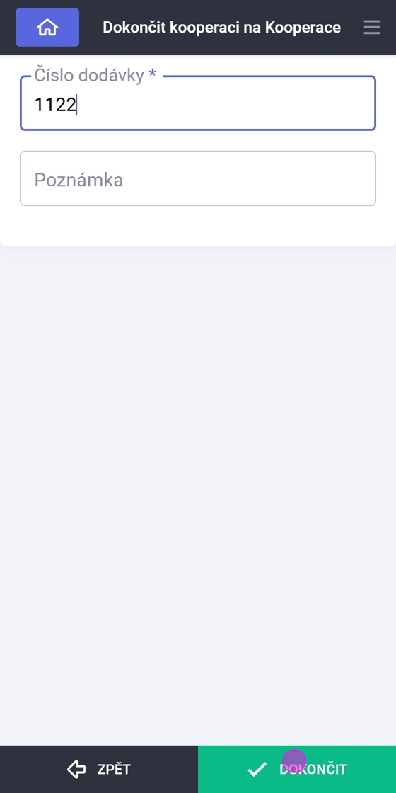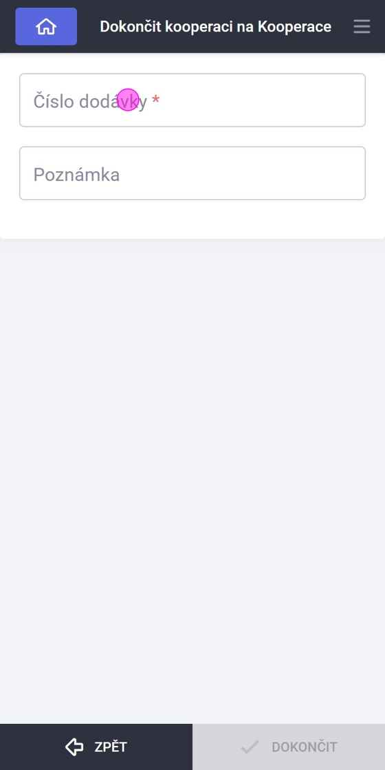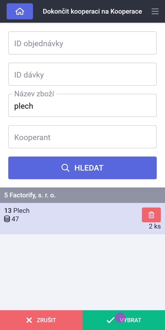 Tento proces není povinný a lze jej využít v případě, kdy pracovník kooperace potřebuje od skladníka informaci, že dávky připravil do kooperece. Dokončením tohoto procesu se do kooperační objednávky k připraveným dávkám přidá zelená fajfka.