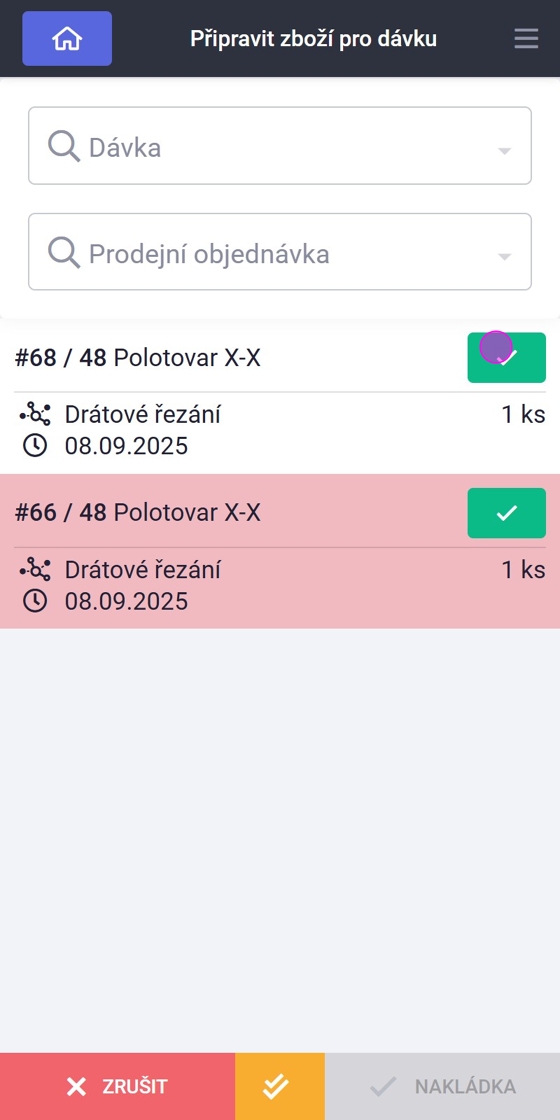 8. Potvrdit výběr dokončovaných dávek kliknutím na "Vybrat".