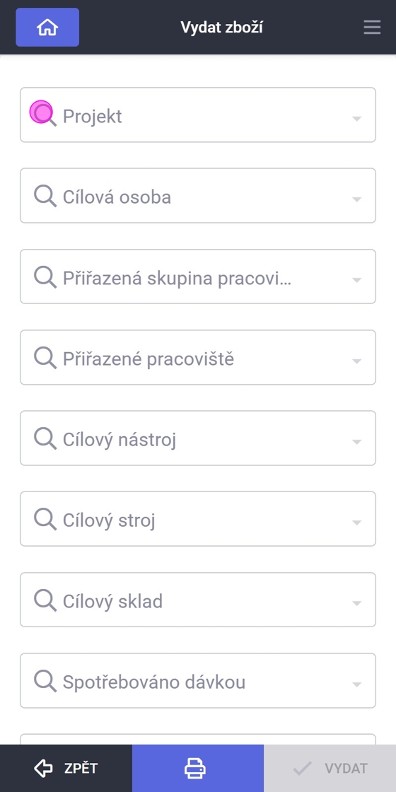 Je možné vybrat naskenováním štítku skladu, skladové pozice a osoby.