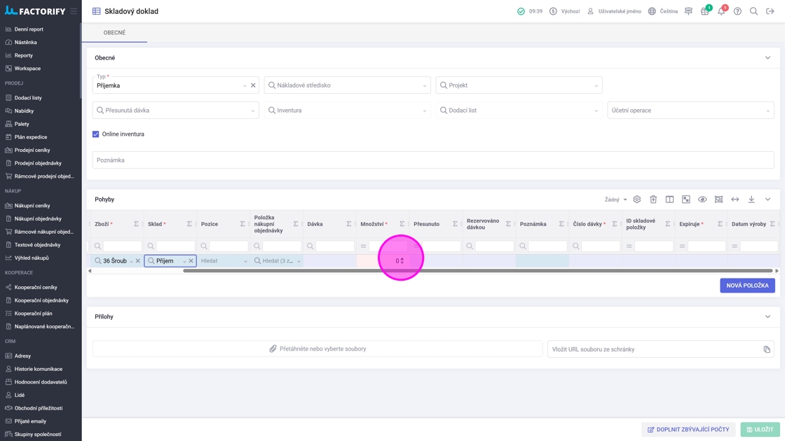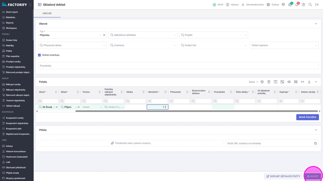 1. V agendě "Skladové pohyby" kliknout na tlačítko se zeleným plusem "Vytvořit nový záznam".