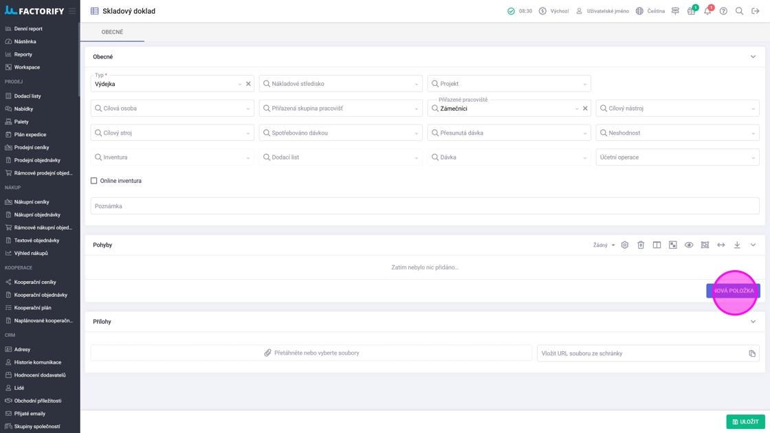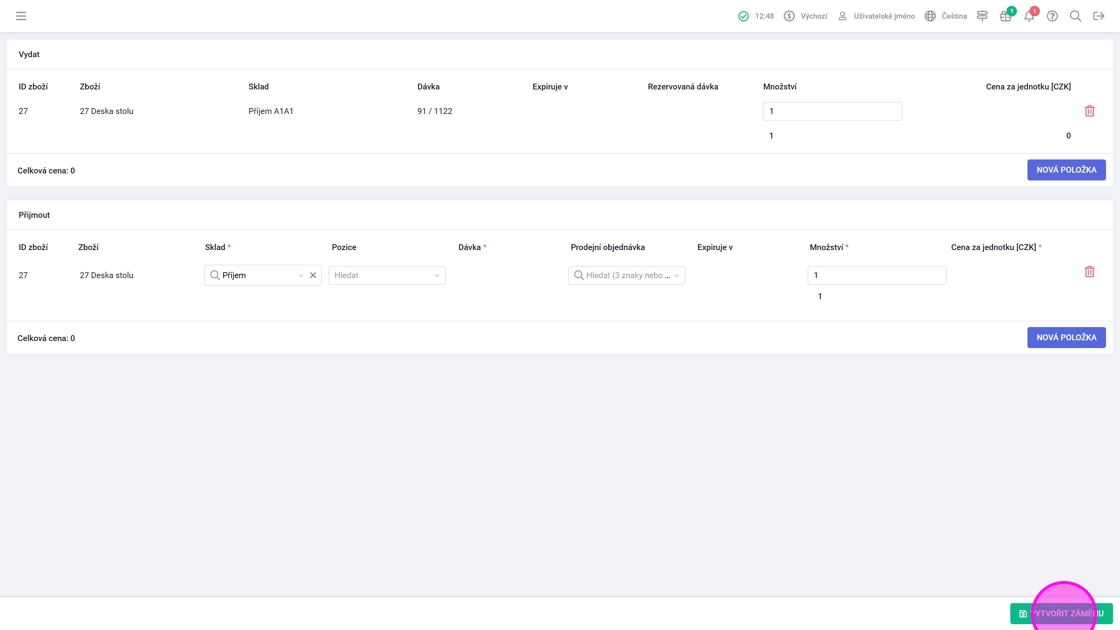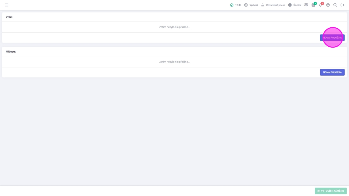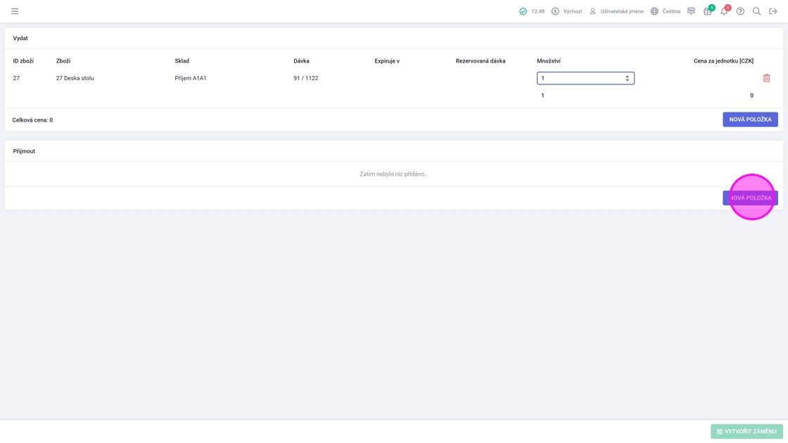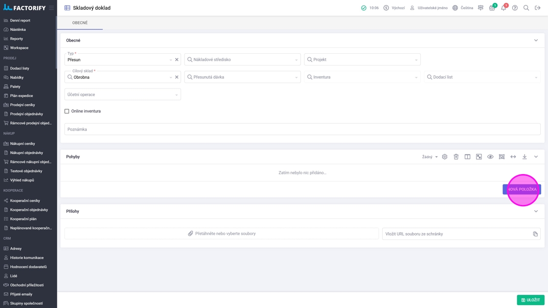 5. Kliknout na "Nová položka" pro přidání položek přesunu.