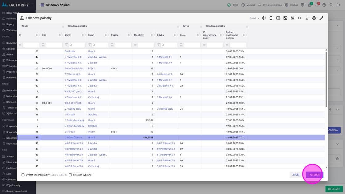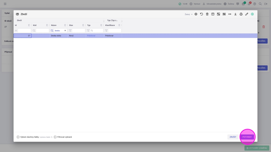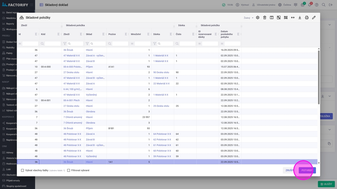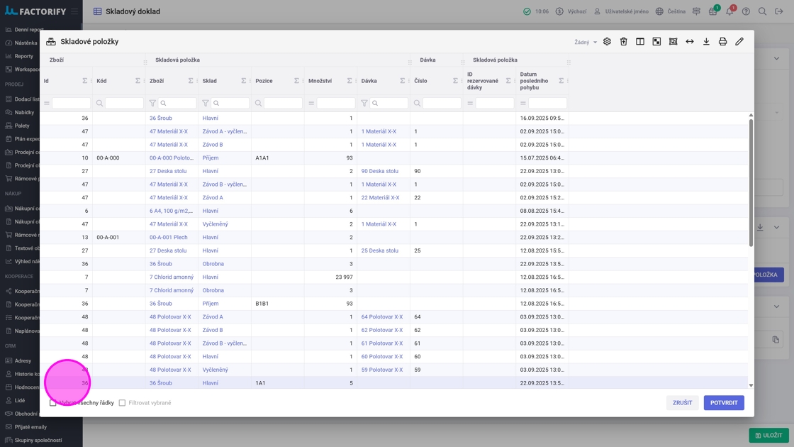 10. Kliknutím na řádek vybrat a potvrdit konkrétní sklad.