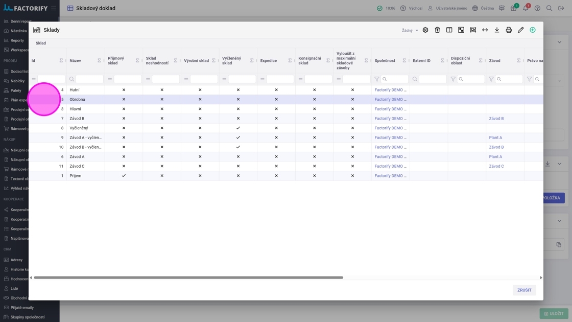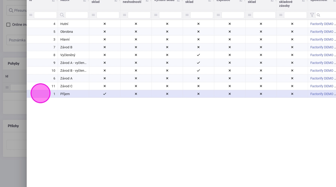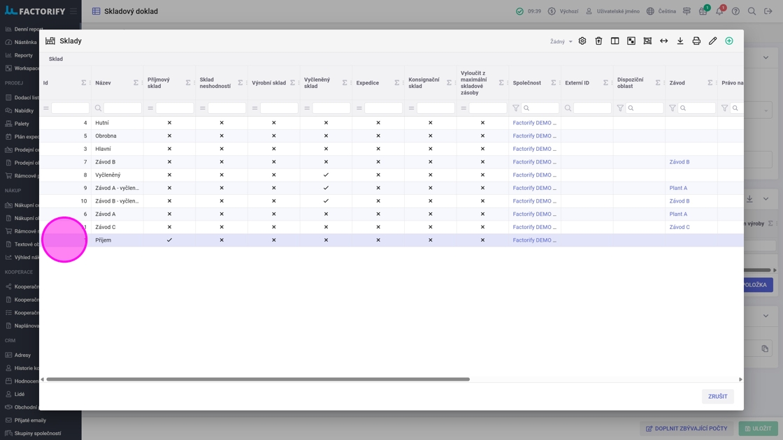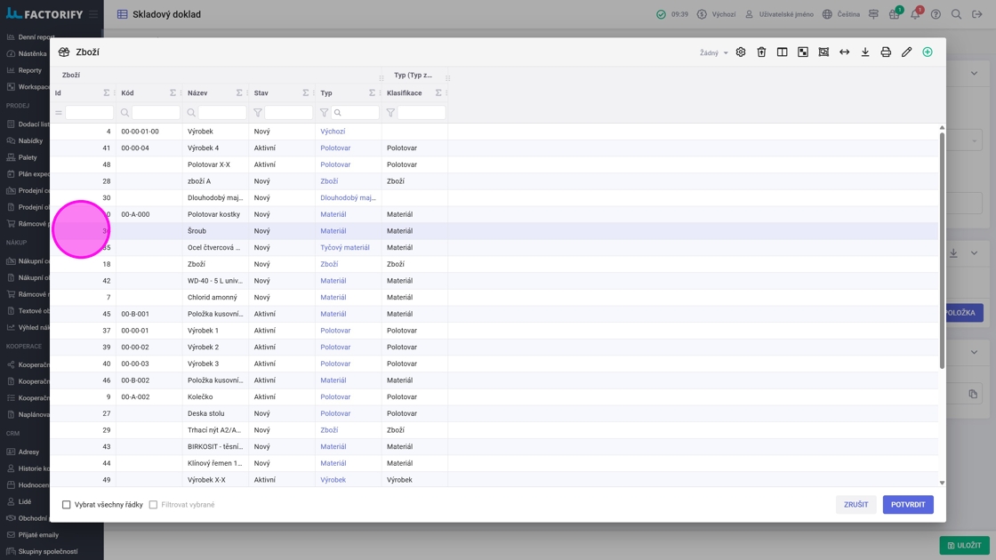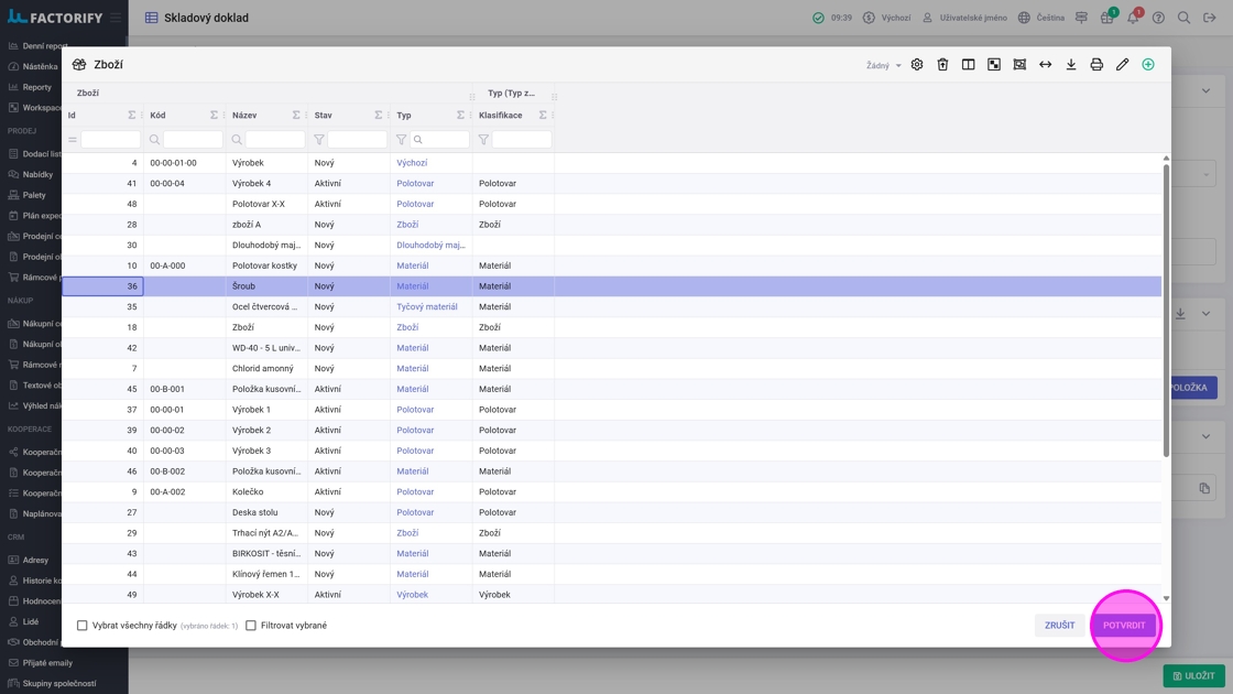 10. Kliknutím na řádek vybrat a potvrdit konkrétní sklad.