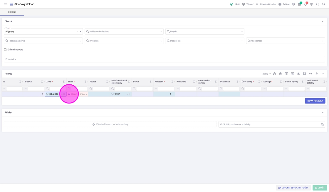 9. Vybrat sklad, na který se má zboží přijmout. Kliknout na "lupu" v poli ve sloupci sklad.