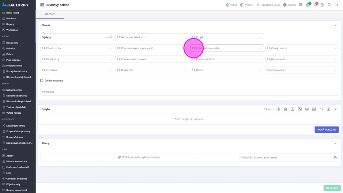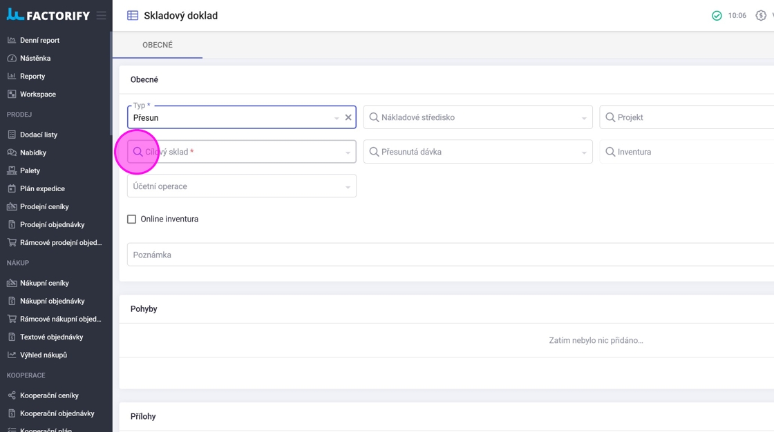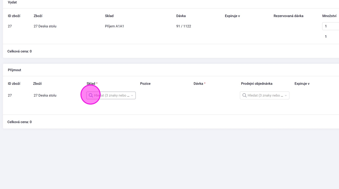 3. Vybrat sklad, na který se má zboží přesunout. Kliknout na "lupu" v poli cílový sklad.