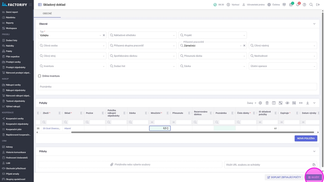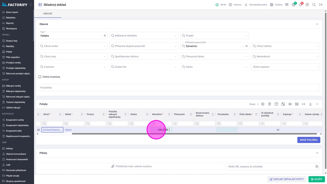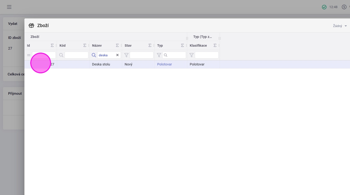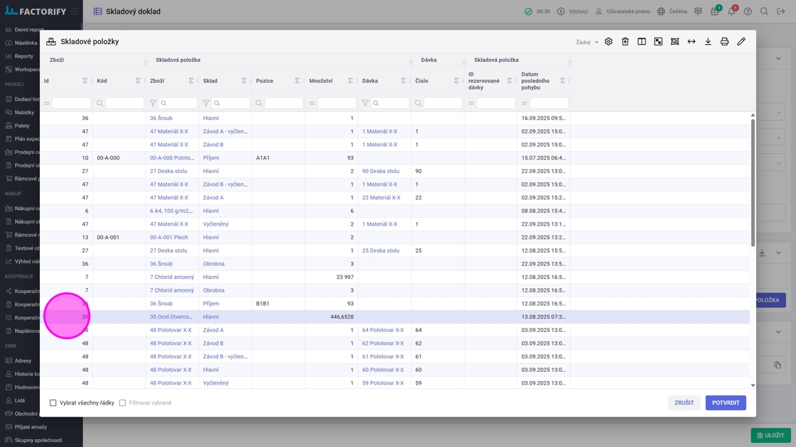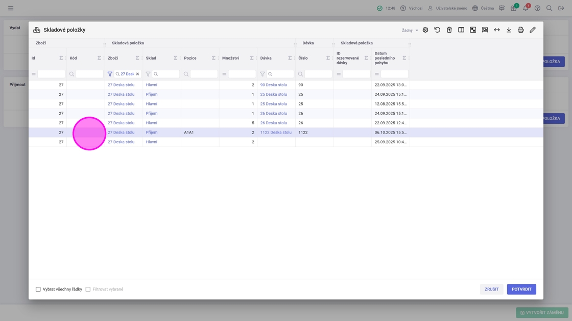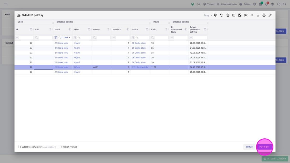 6. Kliknutím na řádek vybrat konkrétní skladové zásoby.