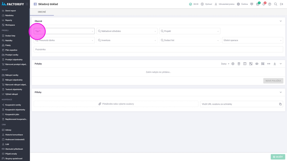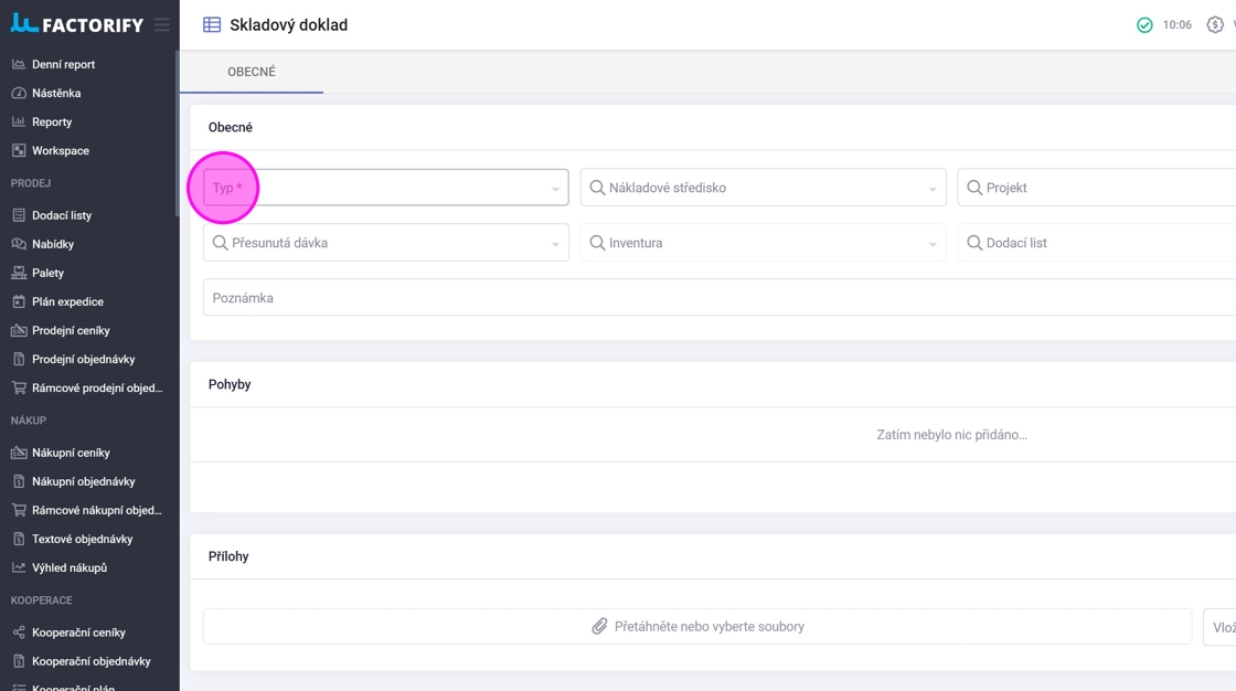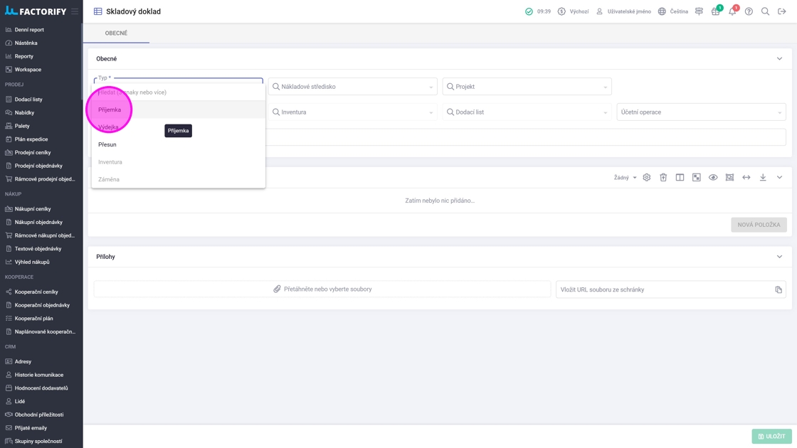2. Kliknout do pole "Typ" a vybrat "Příjemka".