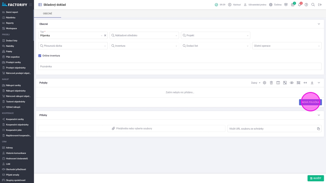 6. Kliknout na "Nová položka" v sekci Přijmout.