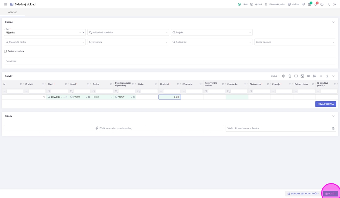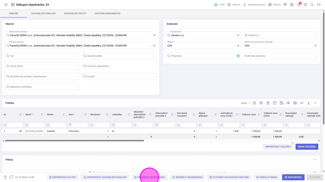Tip: Dojde k vytvoření nového skladového dokladu typu příjemka a automatickému přidání zbývajícího množství všech položek ve stavu Potvrzeno nebo Objednáno.