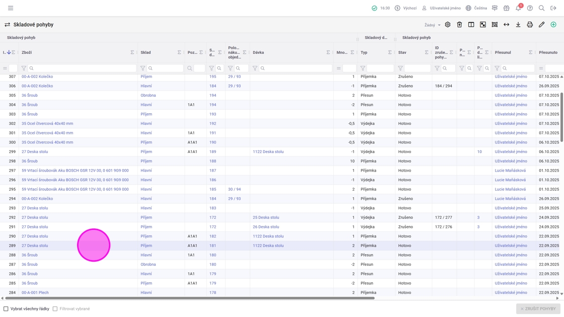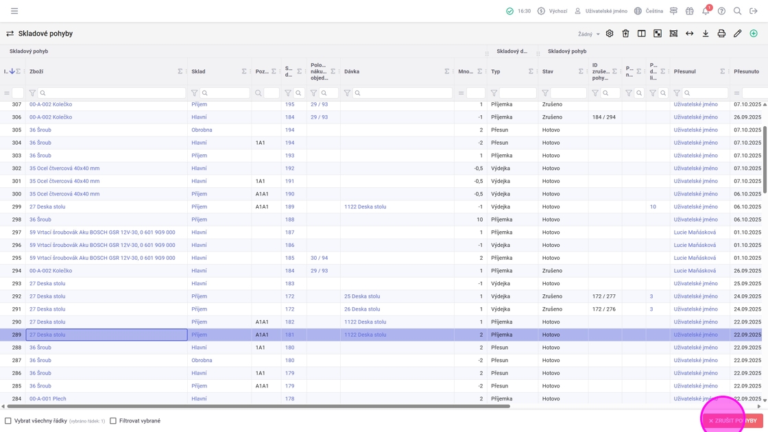 2. Kliknutím na řádek označit pohyby, které se budou chtít zrušit.