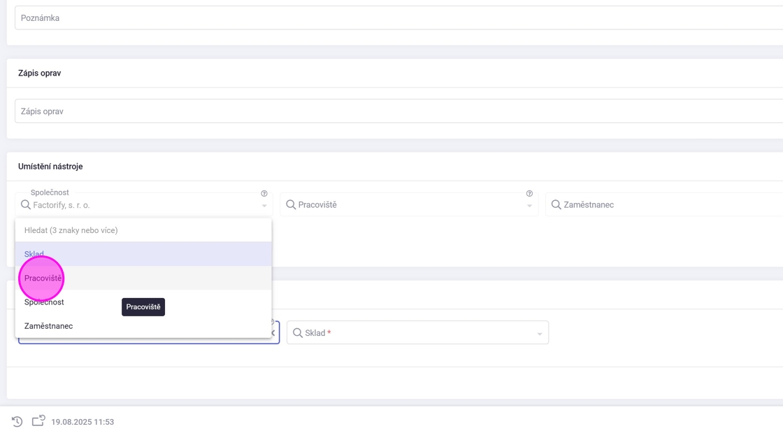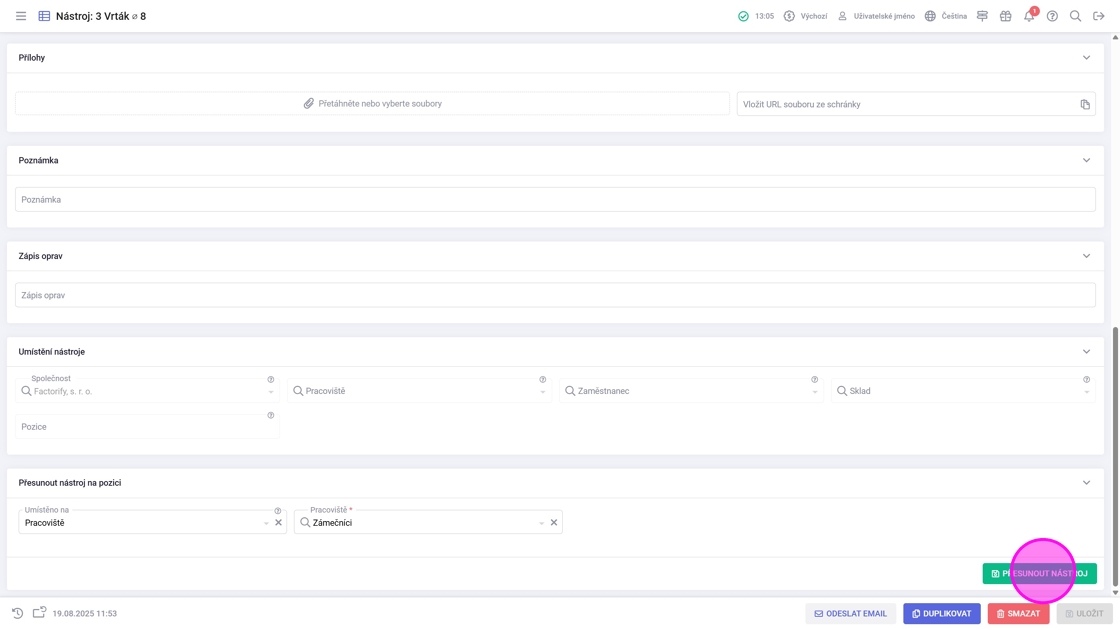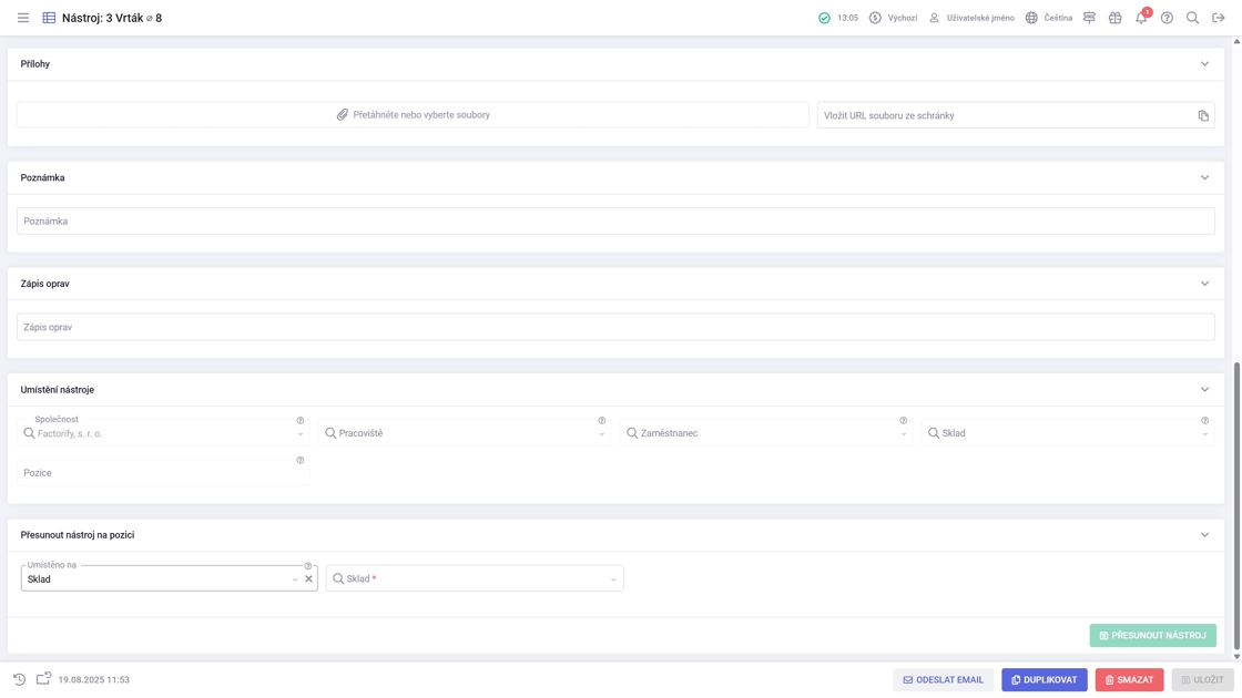 Tento proces není povinný a lze jej využít například v případě, kdy je na typu nástroje nastaveno přenášení nástroje skladníkem, což znamená hlídání dostupnosti nástroje a s tím související nutnost přesunů. Dokončením procesu se na detailu nástroje vyplní jeho aktuální umístění.