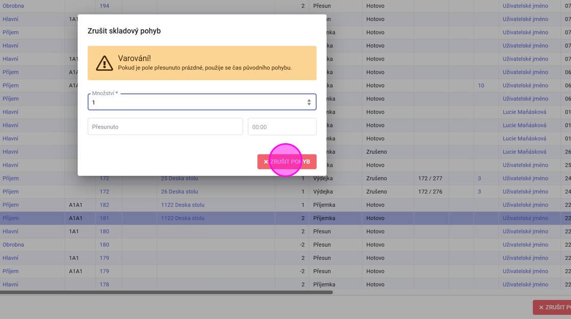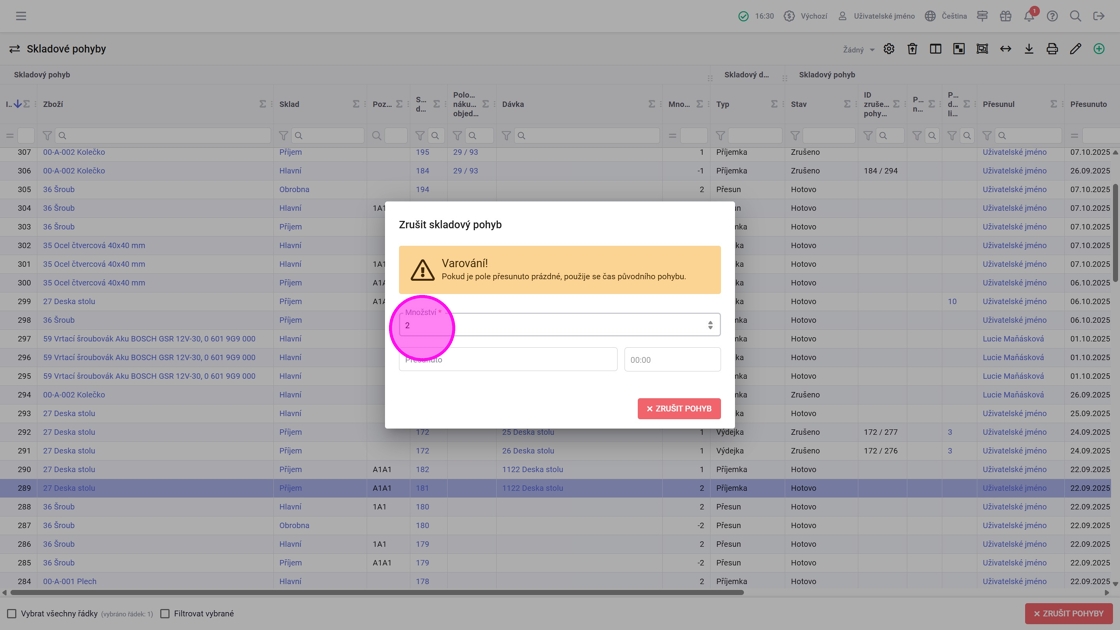 4. Upravit množství, pokud se požaduje pouze částečné zrušení, jinak je vždy vyplněno celé množství skladového pohybu.