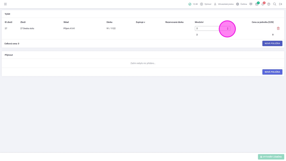 5. Definovat množství, které se má zaměnit. Skladová zásoba se vždy přidá v maximálním množství.