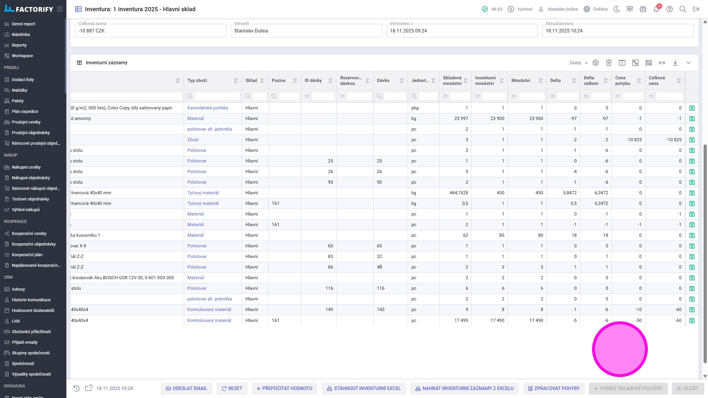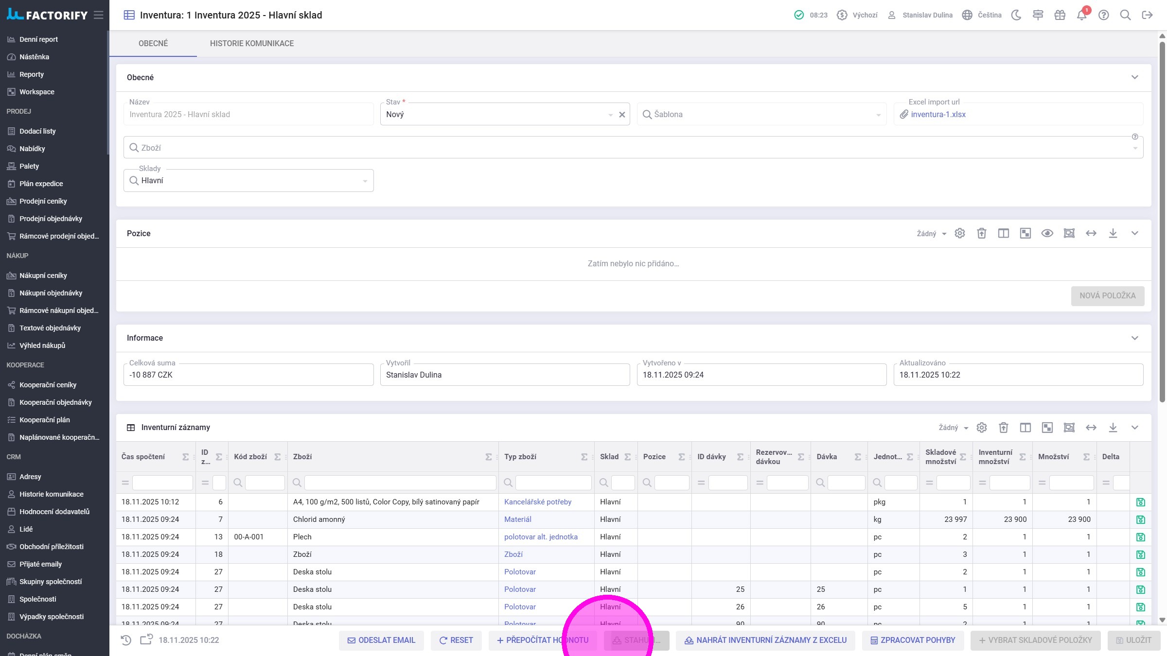 5. Po uložení je vytvořena nová inventura a zobrazí se položky na vybraných skladech, jejich pozice, dávky a množství. Nyní lze začít s fyzickou inventurou.