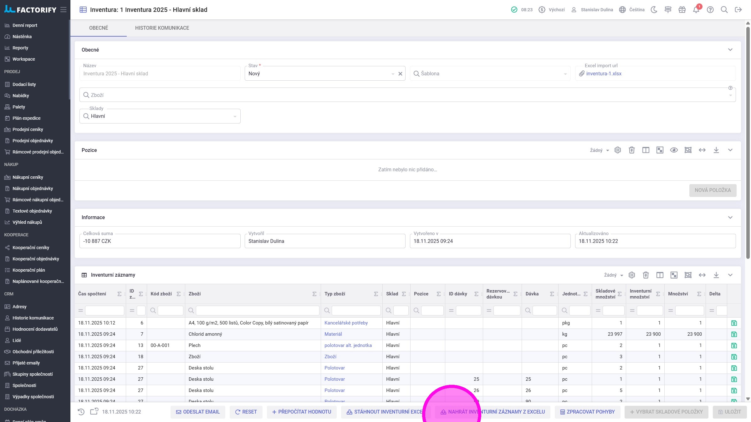 2. Kliknout na tlačítko "Nahrát inventurní záznamy z excelu" a nahrát příslušný excel.