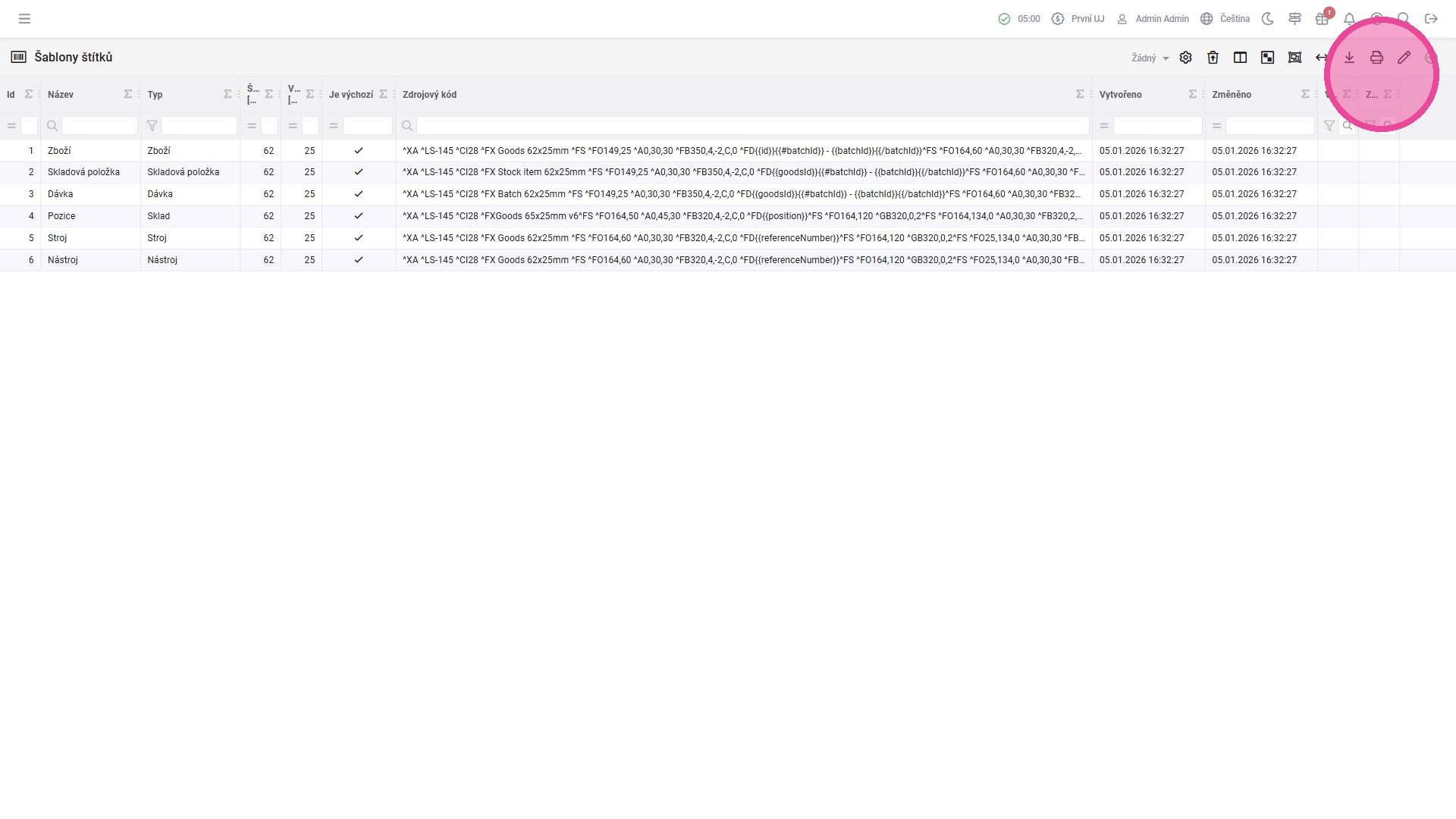 1. Otevřít agendu Šablony štítků, kliknout na ikonu zeleného plus, a vytvořit nový záznam.
