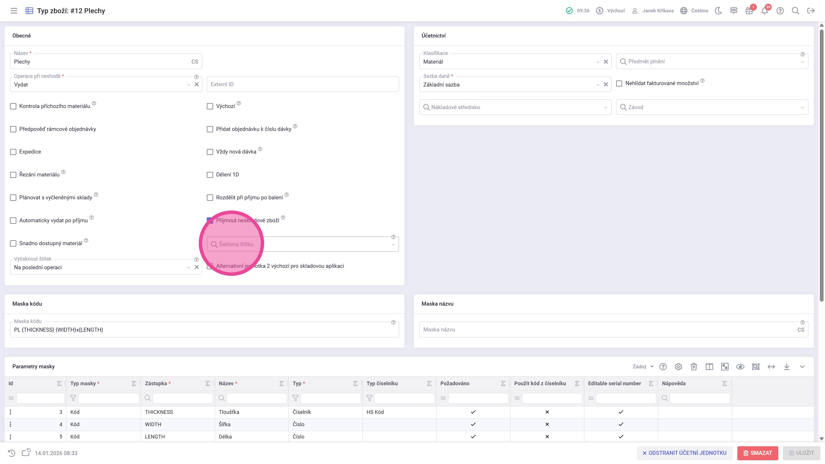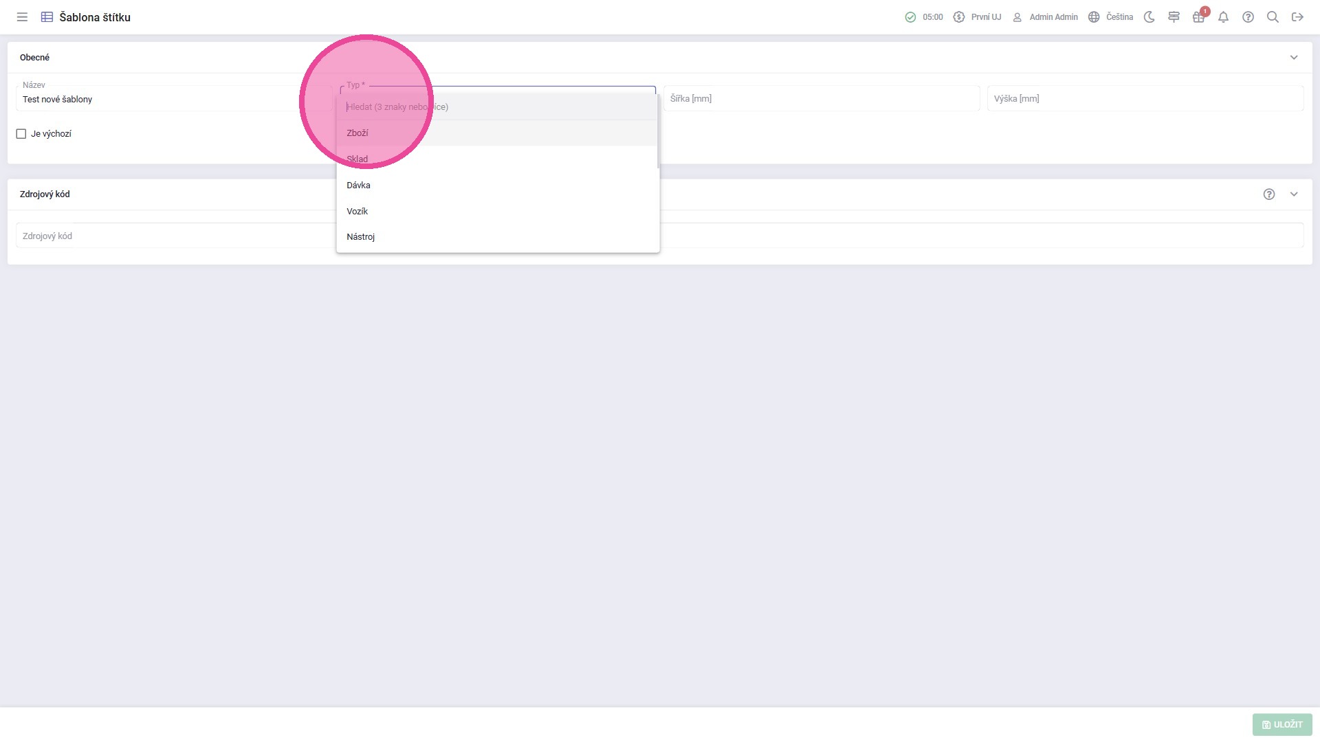 3. Přejít do detailu Typu zboží a vybrat hodnotu v poli "Šablona štítku". Toto nastavení má vliv na tisk štítku z výrobních obrazovek a detailu dávek.