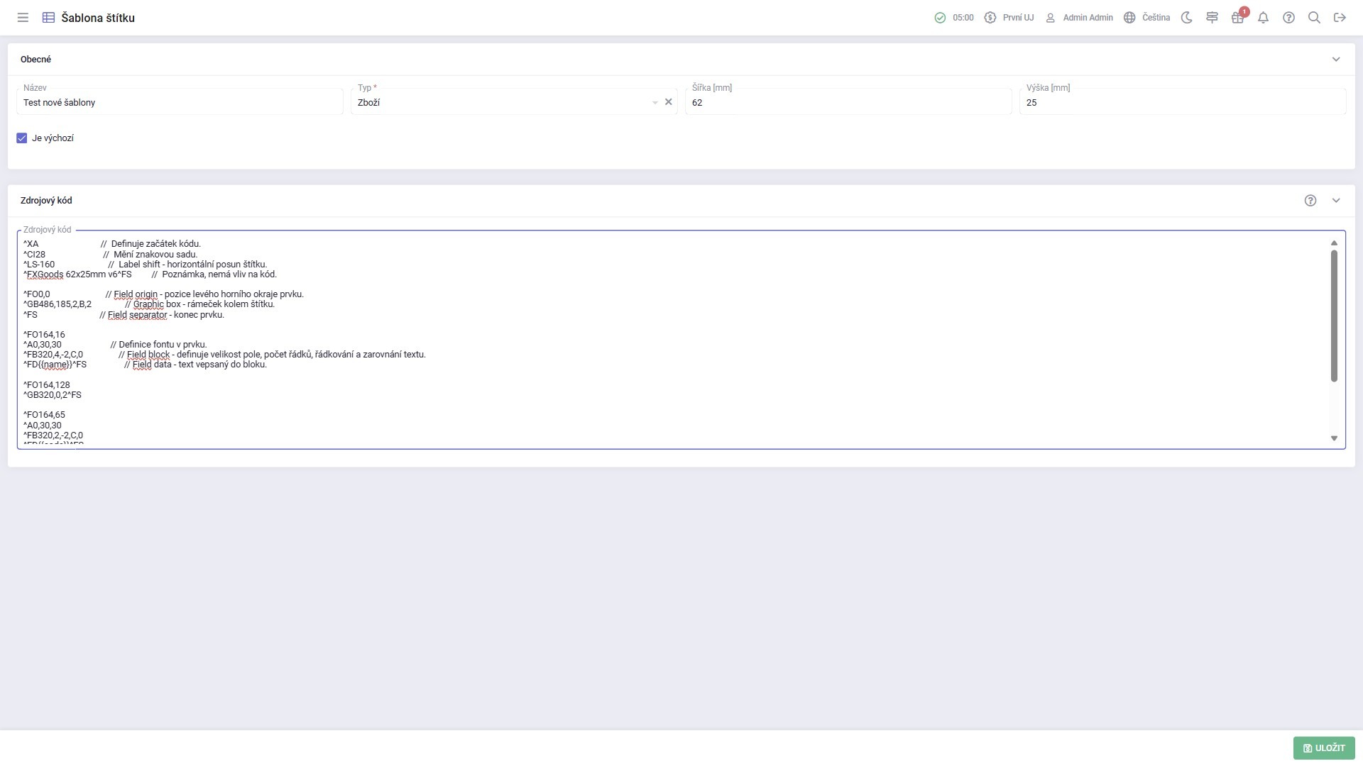 6. Doplnit zdrojový kód v jazyce odpovídající nastavení síťové tiskárny. Zdrojový kód vkládáme vytvořený například za pomoci ZPL editoru, ve kterém lze průběžně kontrolovat design připravované šablony.