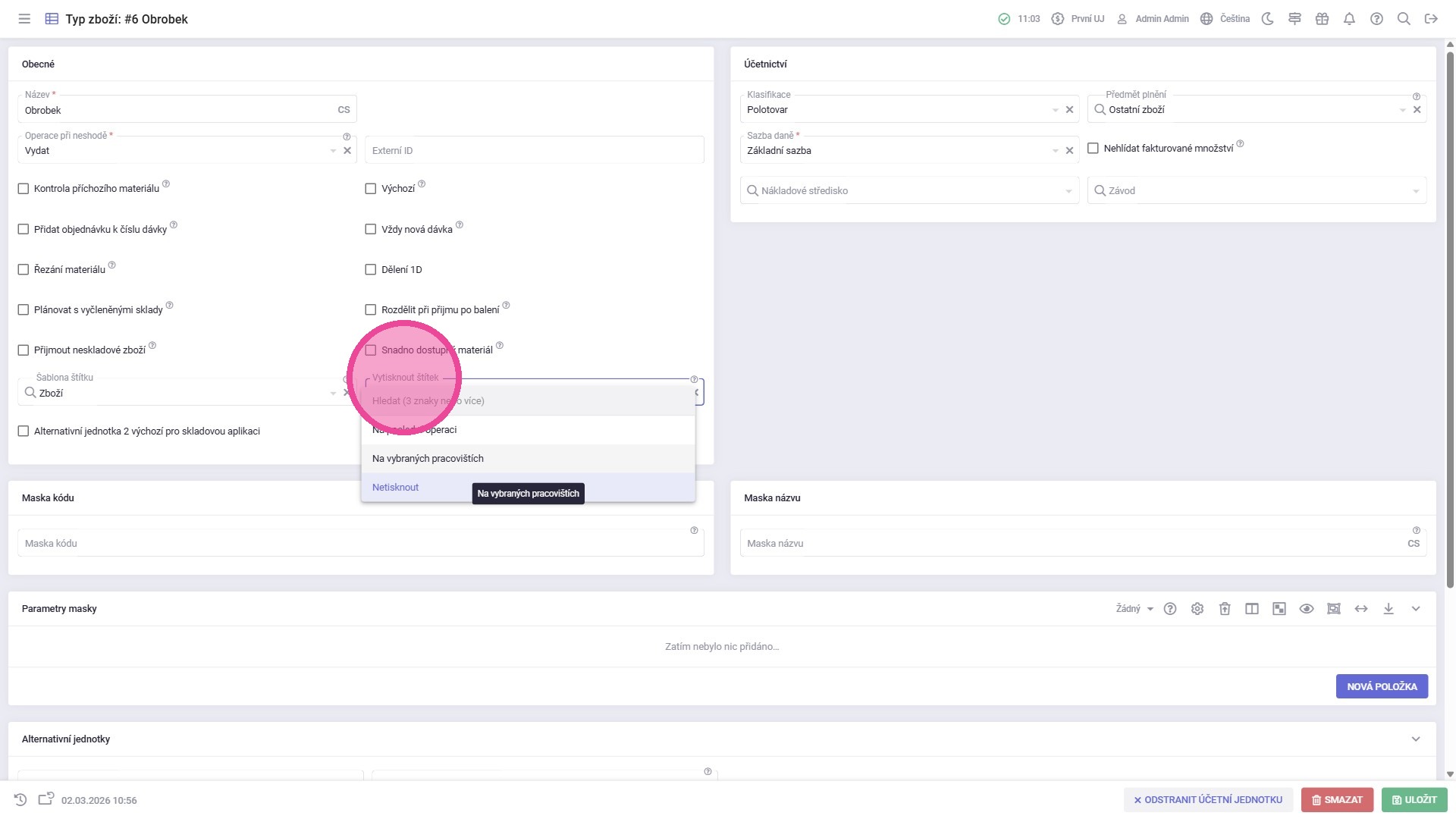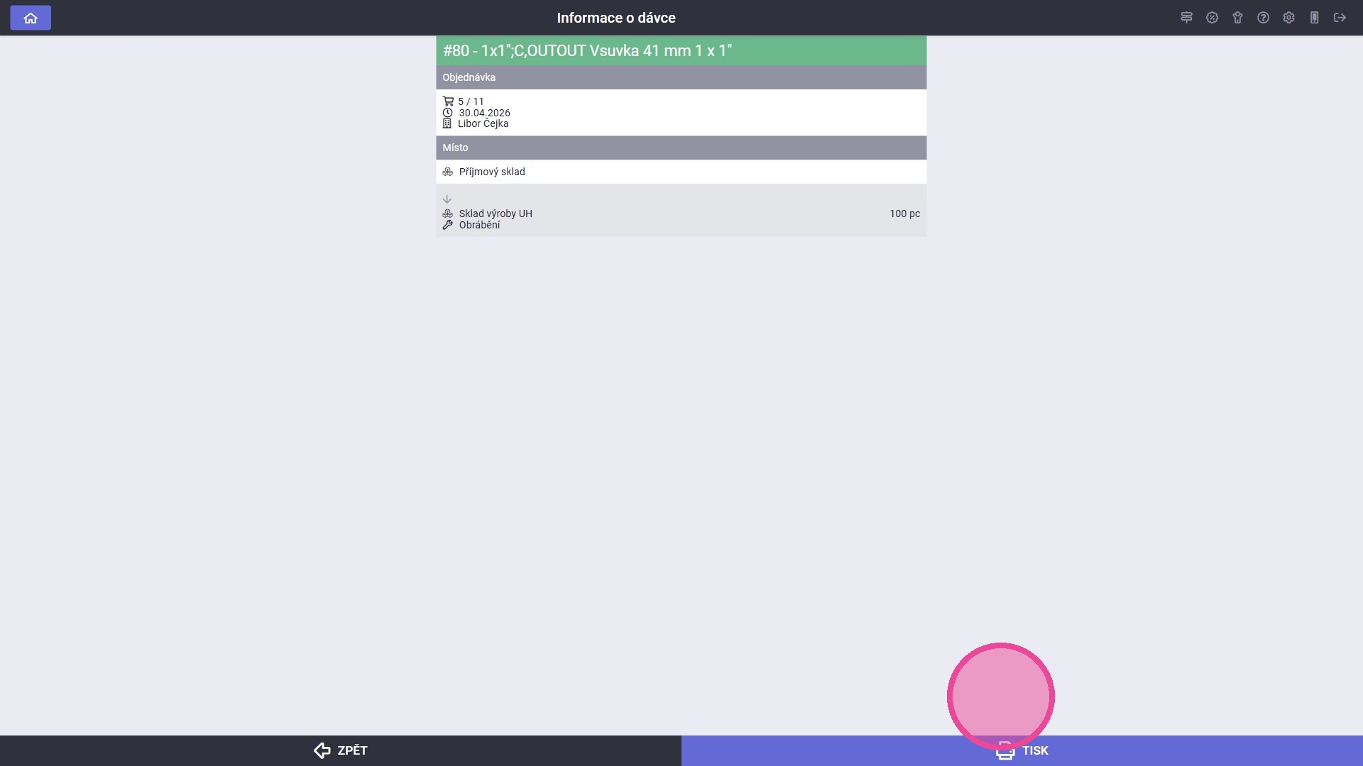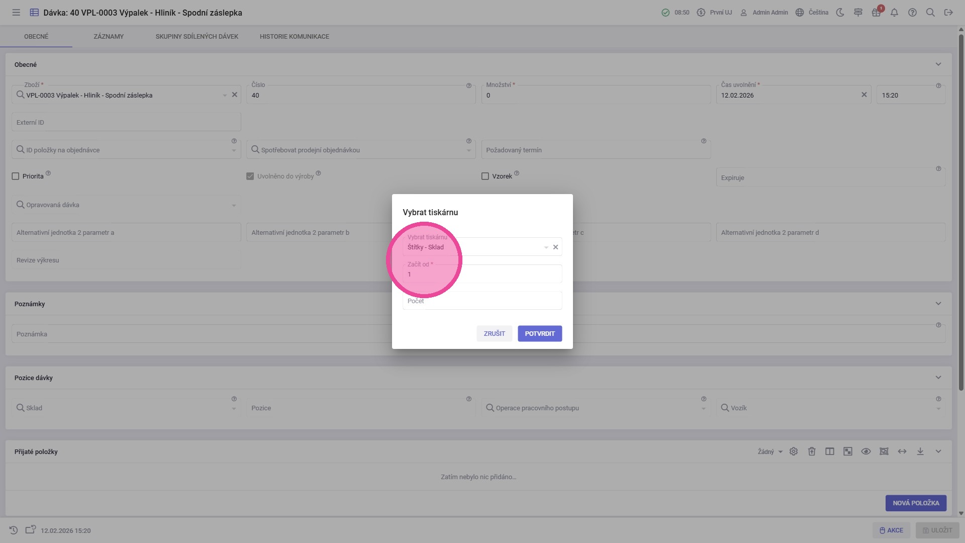 Tip: Možnost "Na poslední operaci" by vyvolala tisk štítku automaticky po dokončení práce na pracovišti, které je poslední v pracovním postupu.