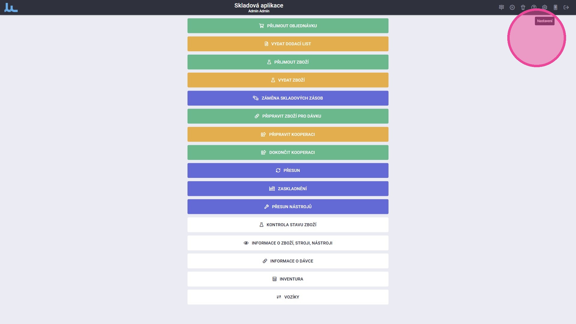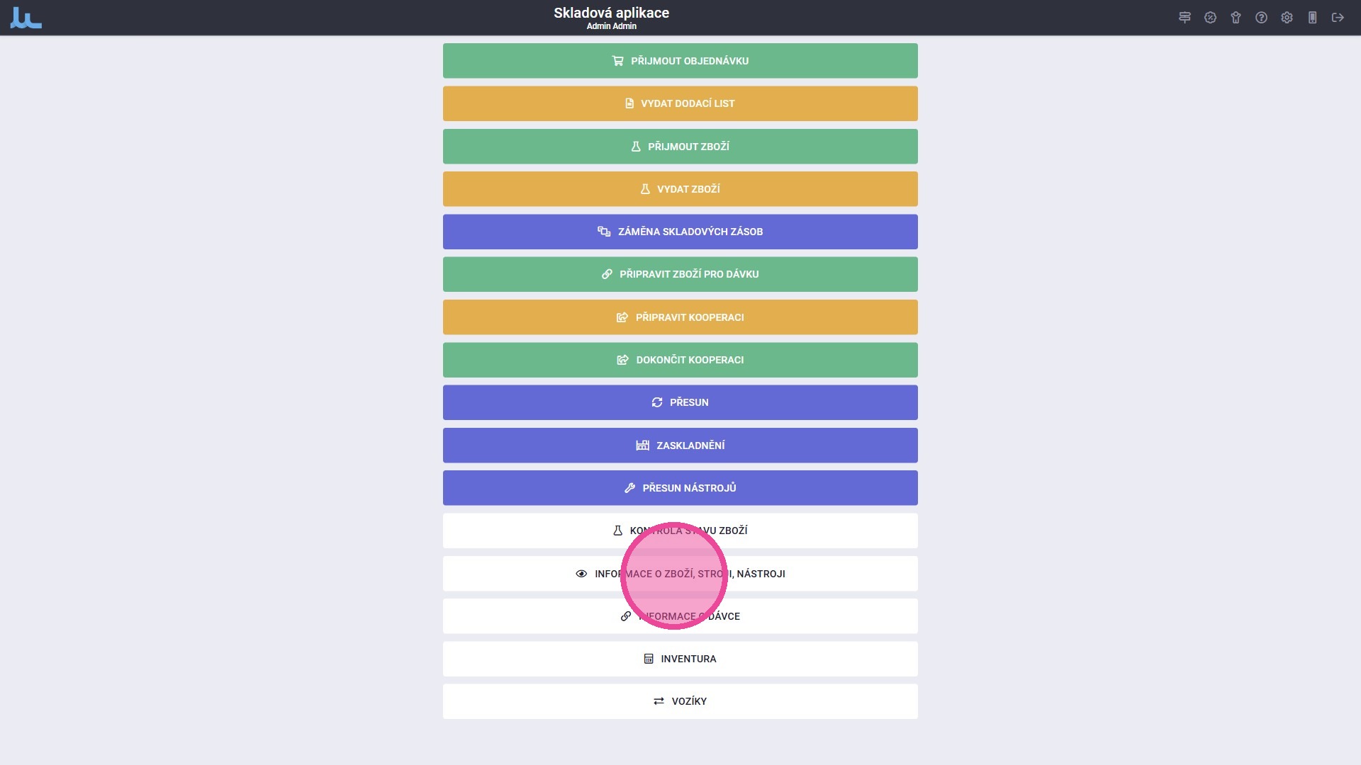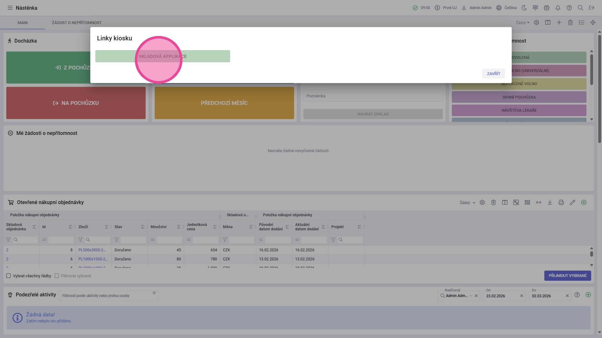 Tip: Na Skladovou aplikaci lze přejít buď z nástěnky doplněním "stock-application" do URL, nebo přes odkaz mezi Linky kiosku (nastavitelné; při absenci odkazu kontaktujte svého Factorify administrátora).