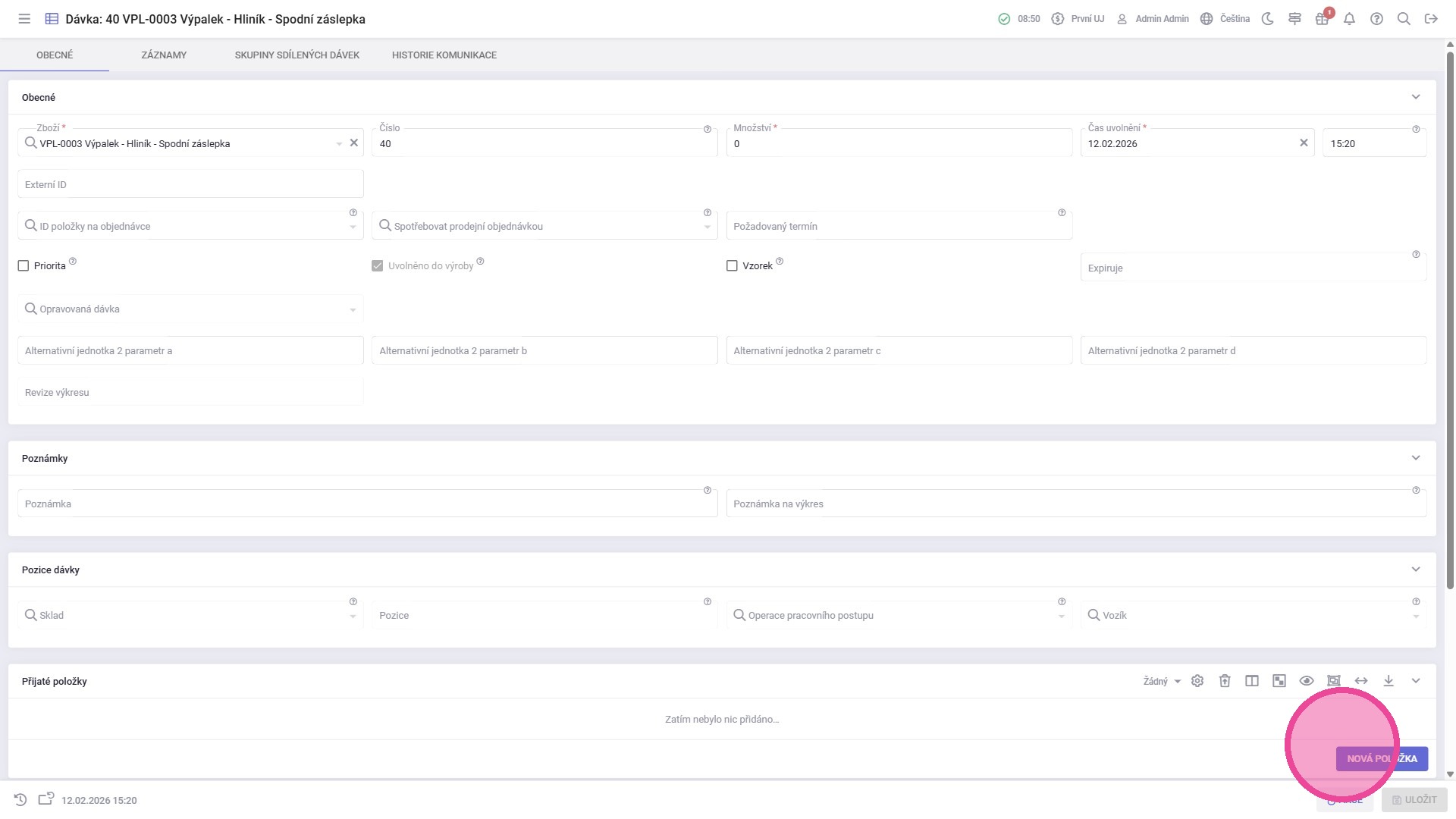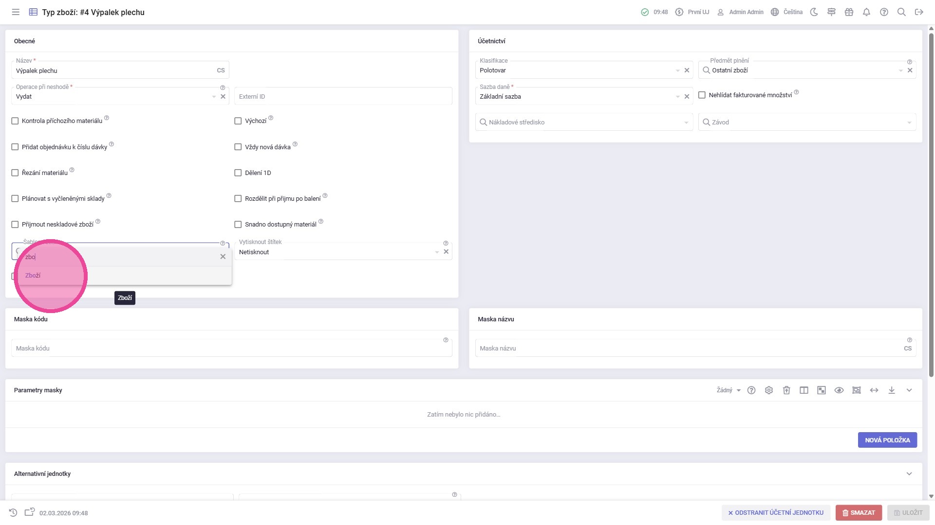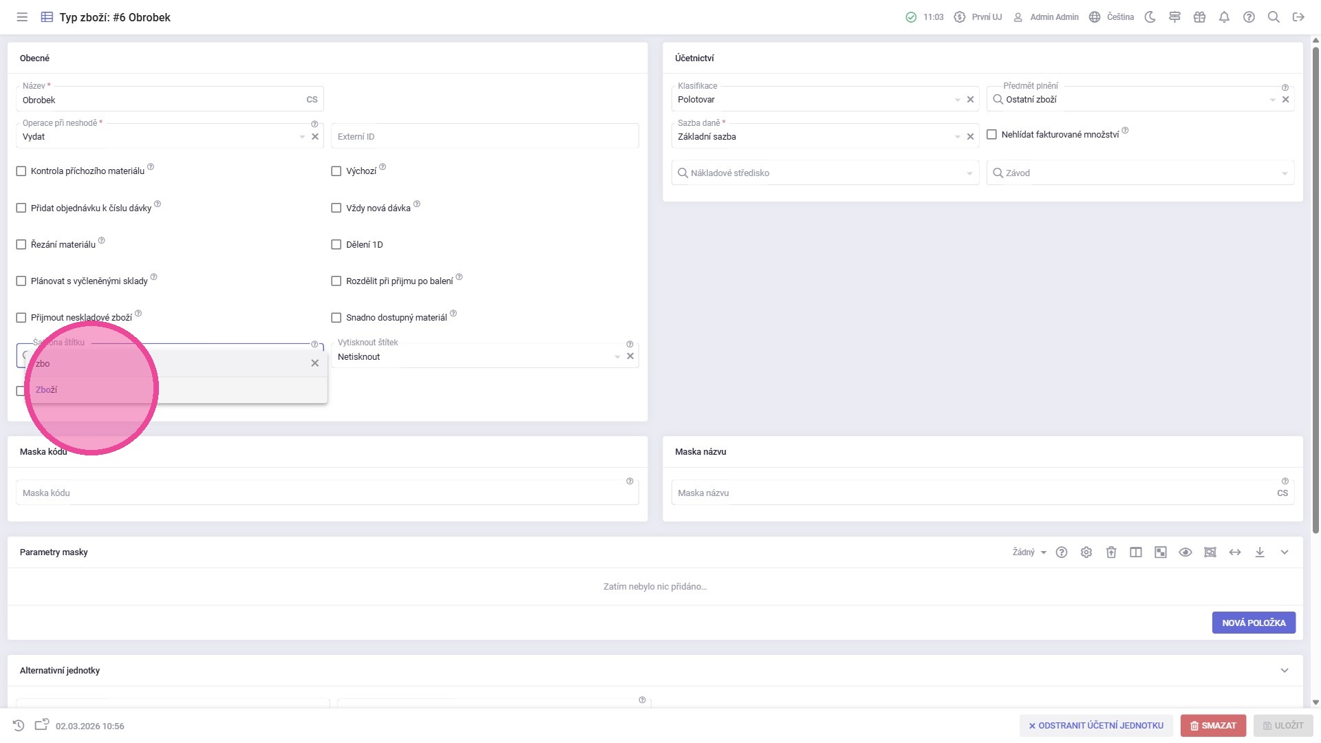 Tip: Informace o typu zboží je dostupná na detailu Zboží. Ten otevřeme buď z agendy Zboží, nebo proklikem z detailu dávky (ctrl + klik na hodnotu v poli "Zboží").