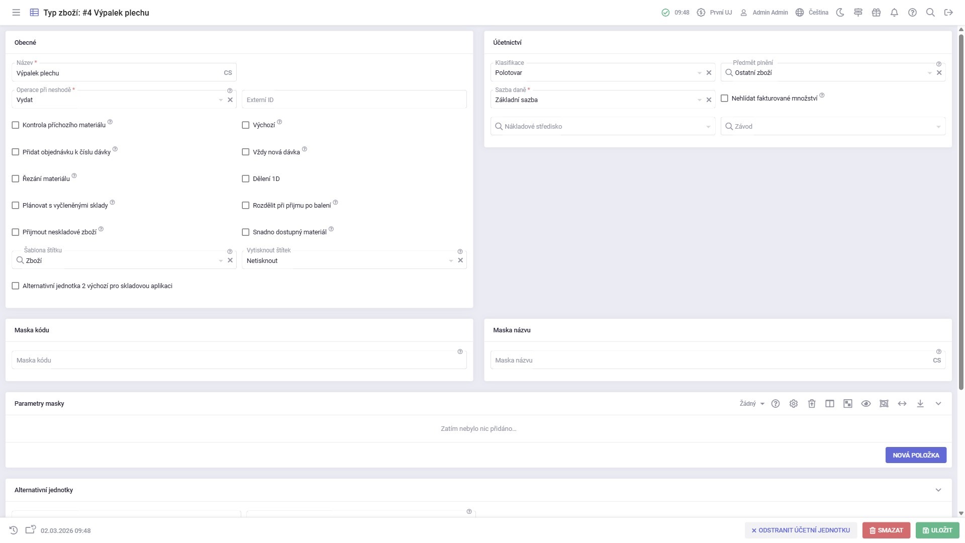 Pokud ve výrobě pracujete s Pracovišti s výrobní obrazovkou "Nesting", kde vznikají odřezky, nebo "Fronta nestingů s odřezky", je vhodné mít právě toto nastavení na Typu zboží vstupující na tato Pracoviště, aby byly odřezky snáze identifikovatelné.