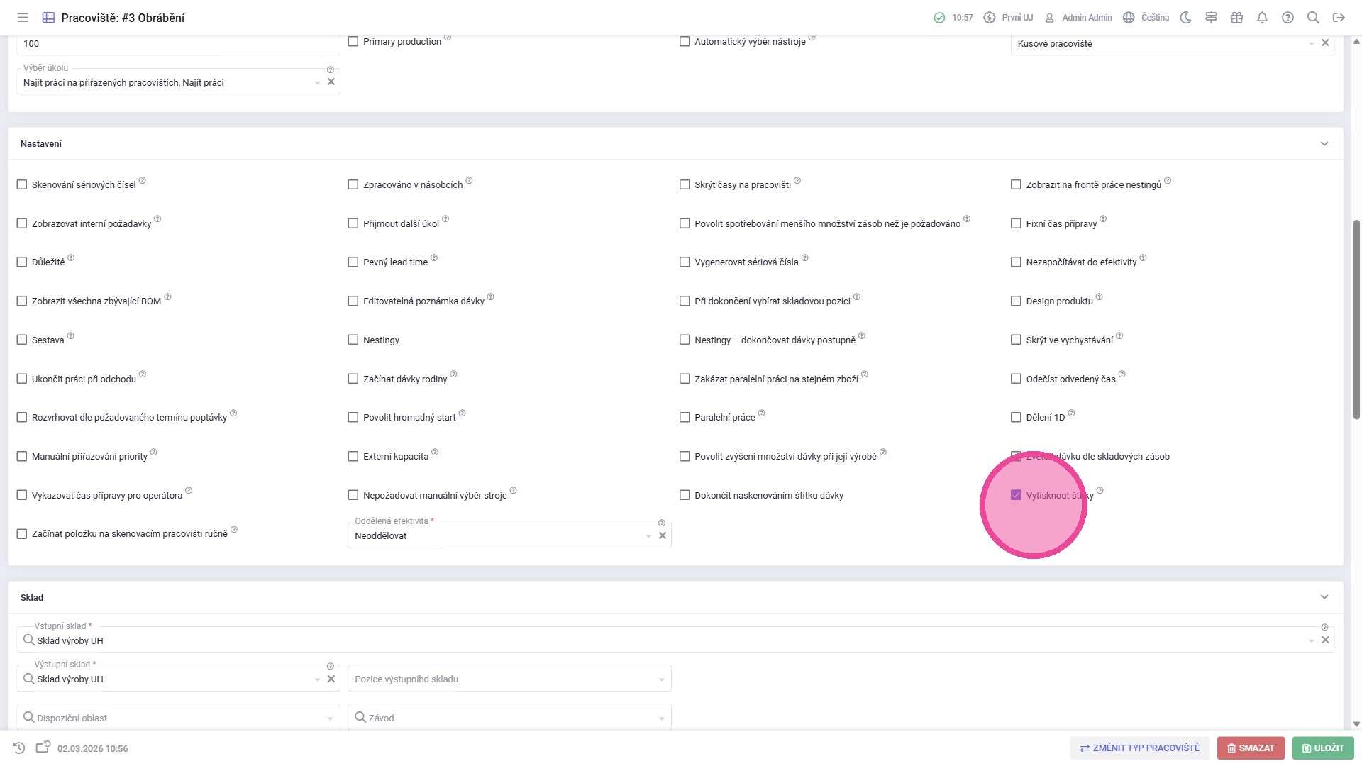 19. Vybrat pracoviště, na kterém chceme zpřístupnit možnost vytisknutí štítku z výrobní obrazovky.