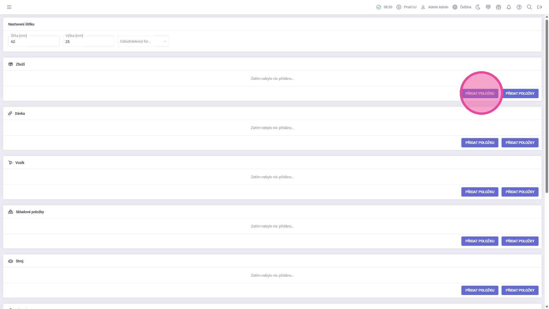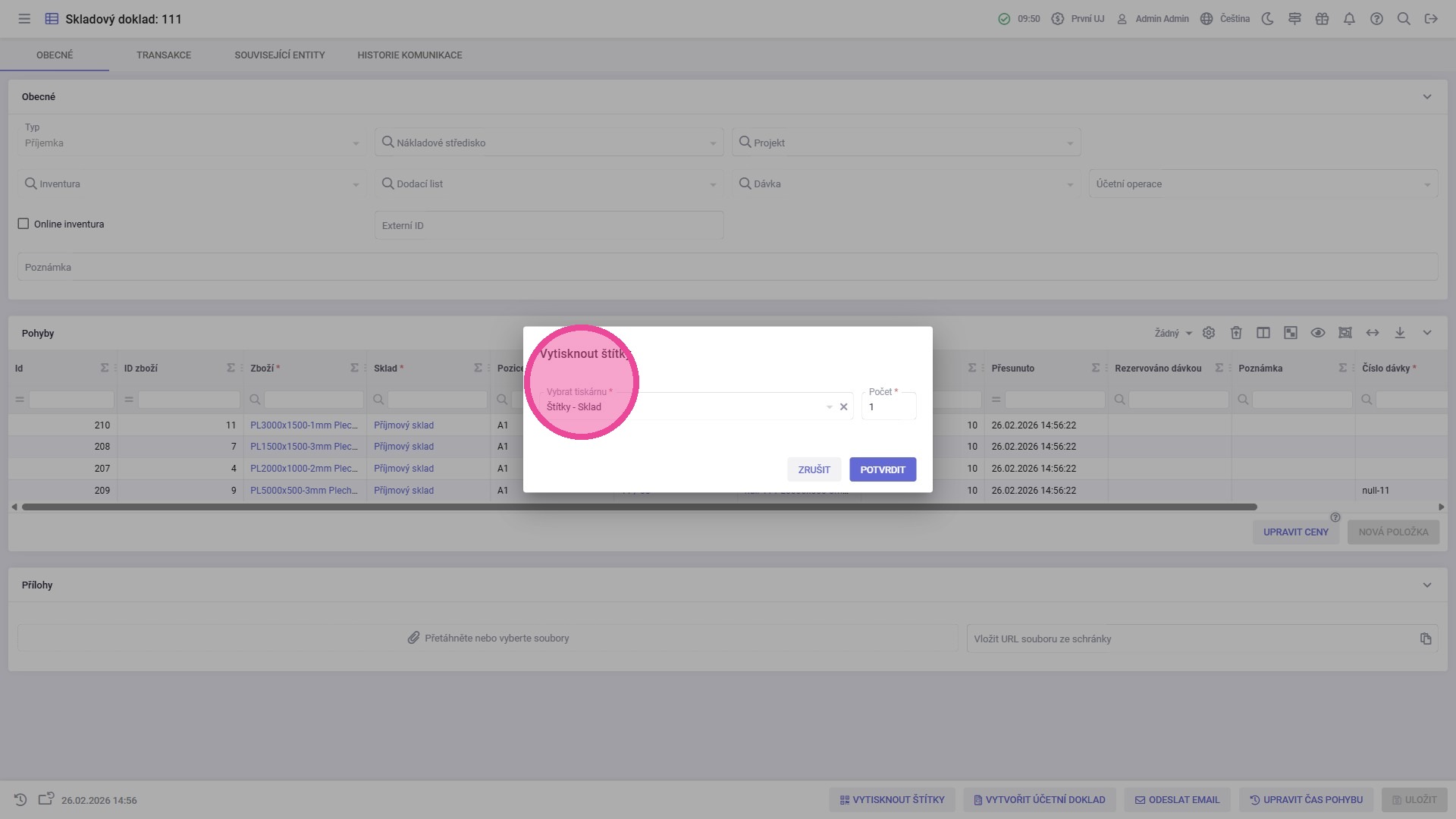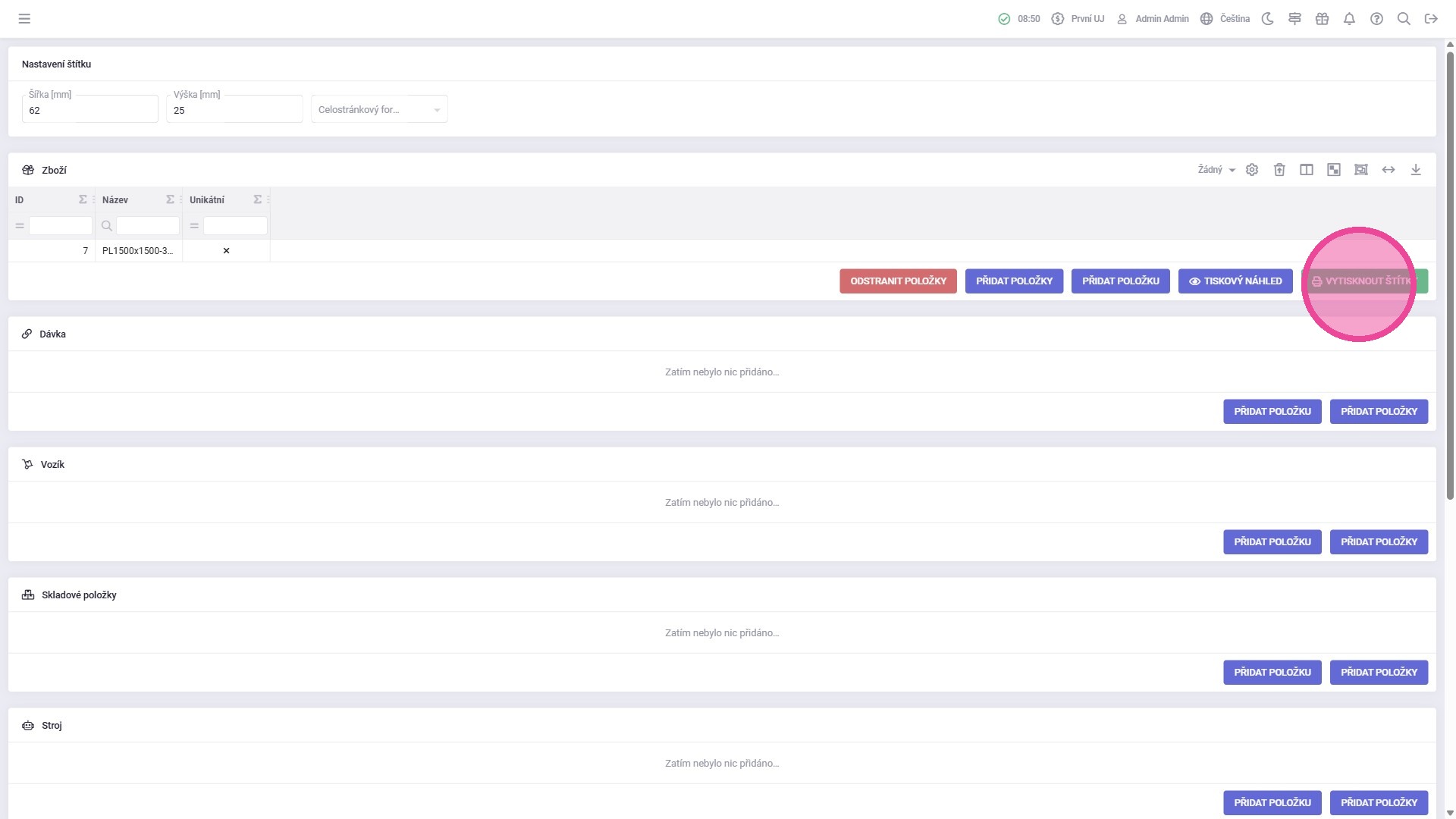 Alert: V tento moment se může stát, že místo vytisknutí štítku uvidíte hlášku, že chybí vybrat šablonu štítku. Ta se nastavuje na Typu zboží.