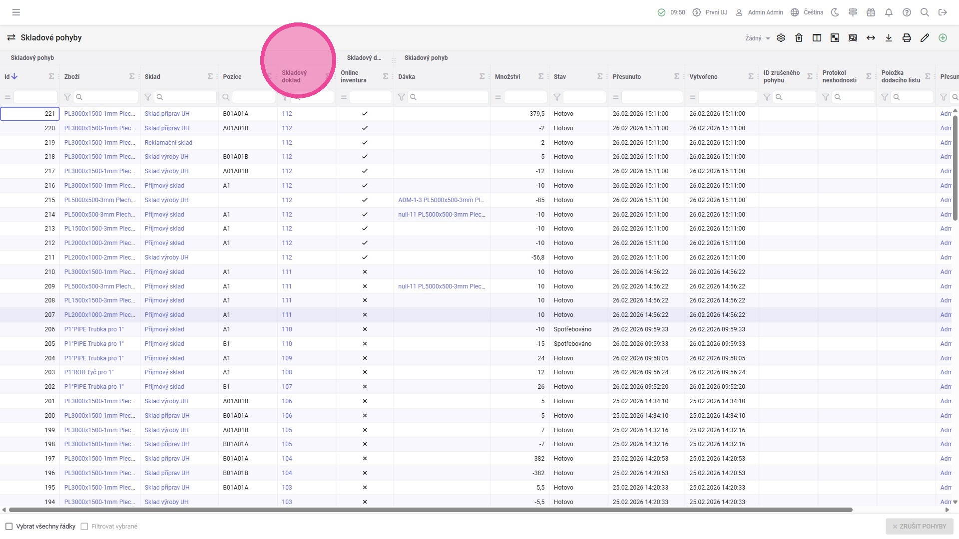 32. Otevřít agendu Skladové pohyby. Poté otevřít požadovaný skladový doklad buď kliknout na odkaz ve sloupci "Skladový doklad", nebo dvojitým kliknutím na konkrétní skladový pohyb, který je součástí skladového dokladu, jenž chci otevřít.