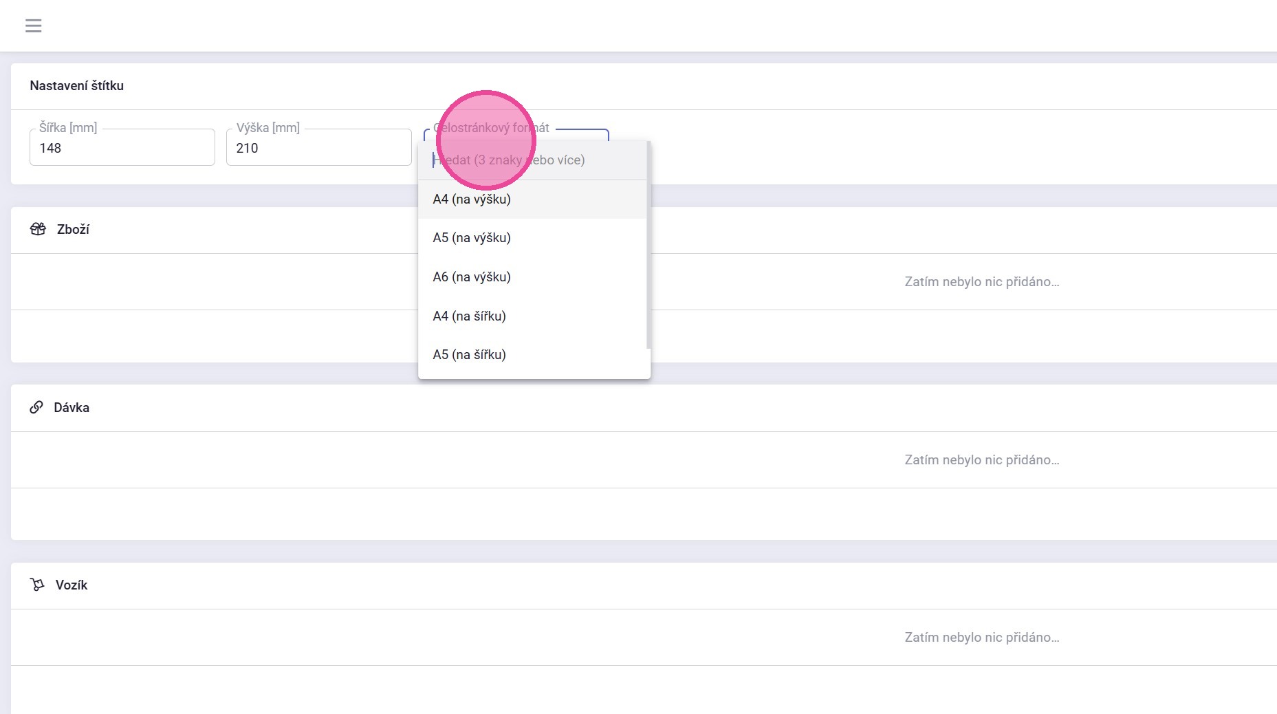 6. V agendě Tisk štítků je možné nastavit i nestandardní rozměr štítku, nebo si vybrat z připravených formátů. V takovém případě pak tisk probíhá na standardní tiskárně a nikoli na tiskárně štítků. Tento alternativní přístup ke značení je blíže popsán v roli Vedoucí skladů a logistiky v sekci Značení skladových pozic.