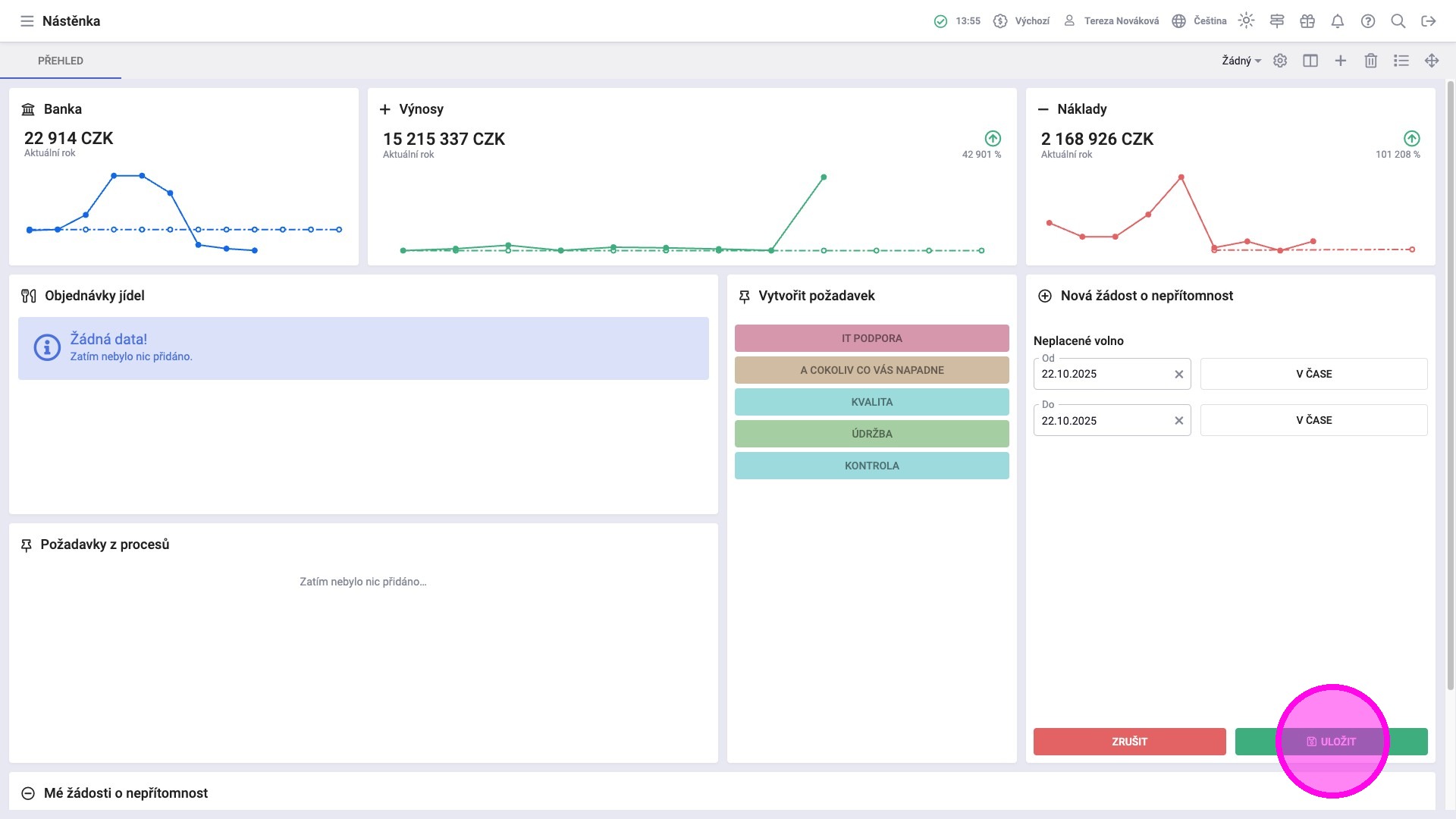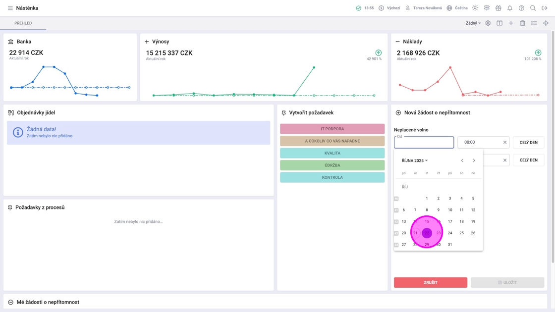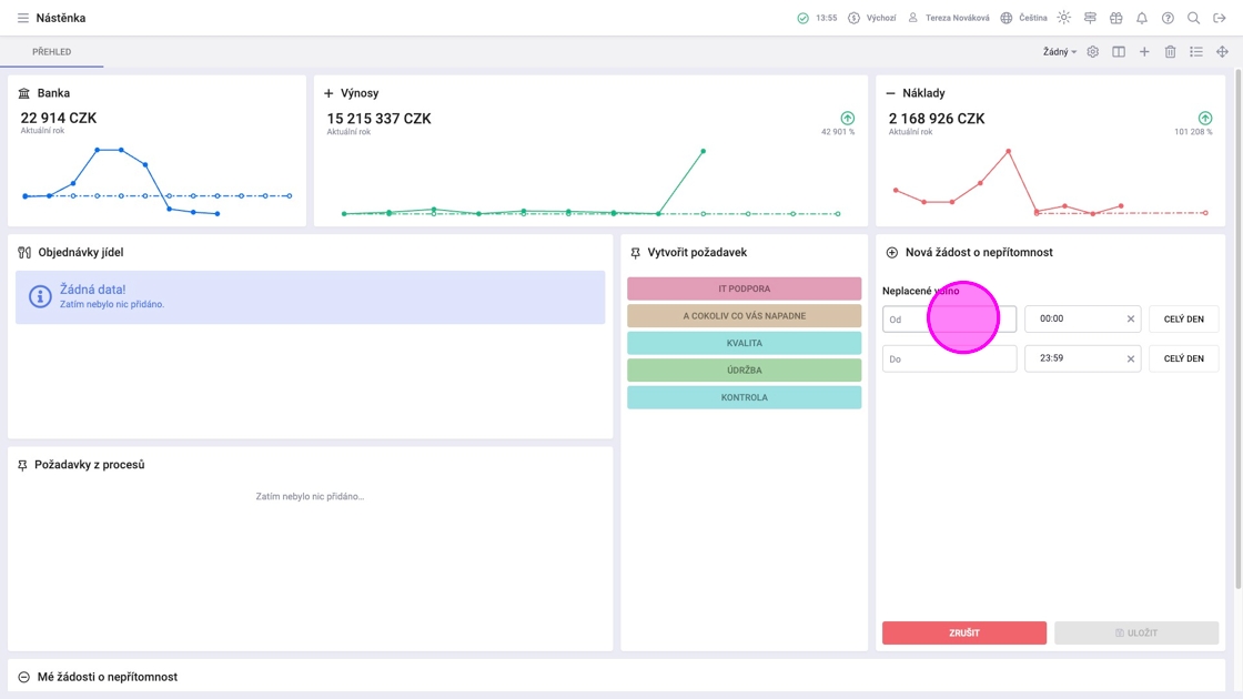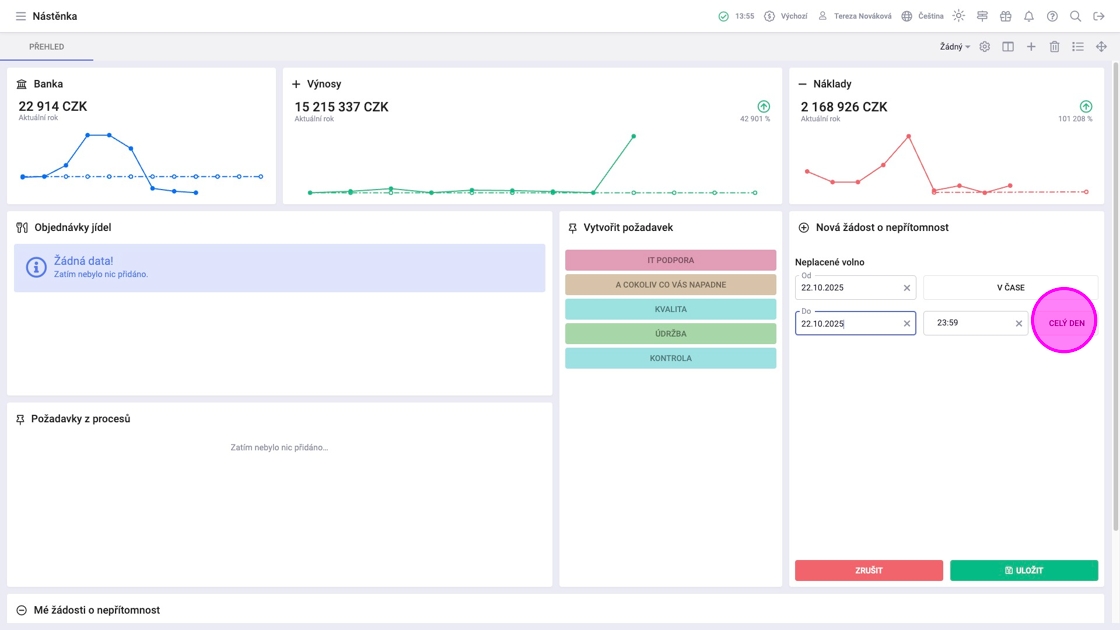 Tip: Přehled žádostí je ve widgetu "Mé žádosti o nepřítomnost". Pro zobrazení právě podané žádosti je potřeba obnovit stránku.