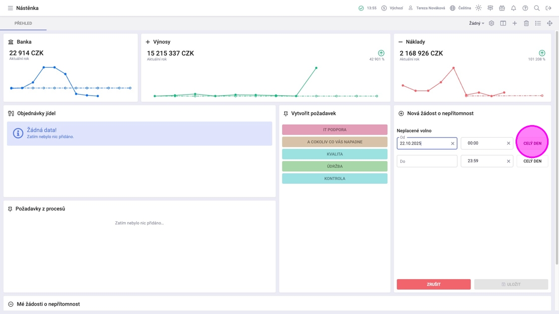 Tip: V závislosti na nastavení Typu nepřítomnosti je možné zvolit část dne, celý den nebo konkrétní čas.