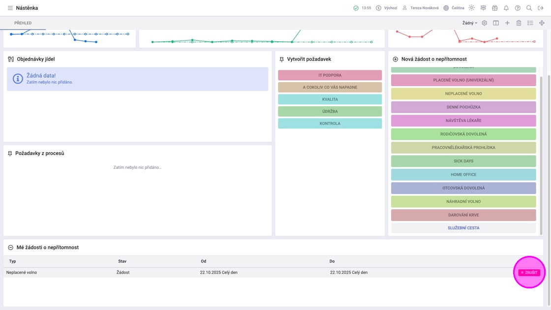 8. Pro stažení žádosti kliknout na tlačítko "Zrušit" u příslušné žádosti ve widgetu "Mé žádosti o nepřítomnost".