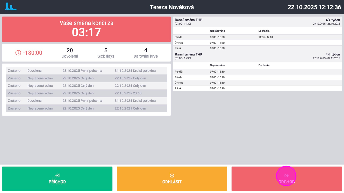 3. Pro ukončení zaznamenávání docházky kliknout na "Odchod".
