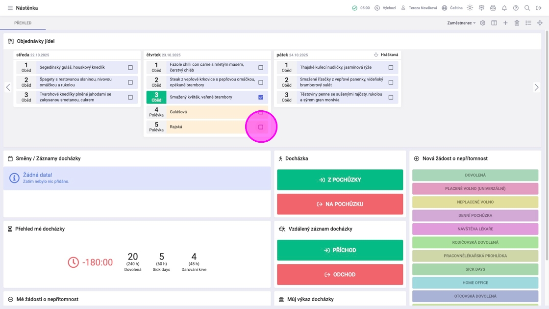 3. V pátek je vidět polévka automaticky objednaná k hlavnímu jídlu.