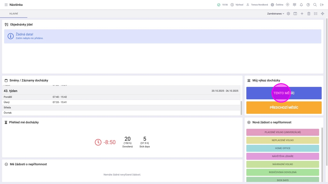 1. Pro zobrazení aktuálního Výkazu docházky kliknout na Nástěnce ve widgetu "Můj výkaz docházky" na "Tento měsíc".