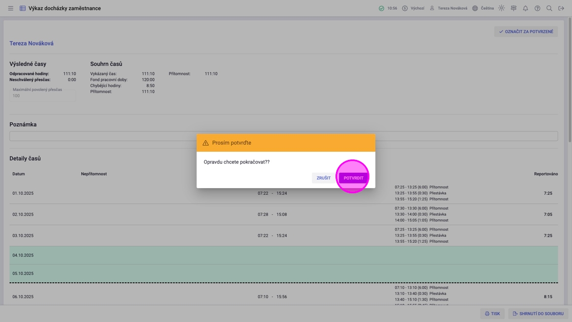 2. V některých firmách je zavedený postup, že zaměstnanec potvrzuje či podepisuje svůj vlastní výkaz docházky. Toto tedy provedete na začátku následujícího měsíce tlačítkem "Označit za potvrzené".