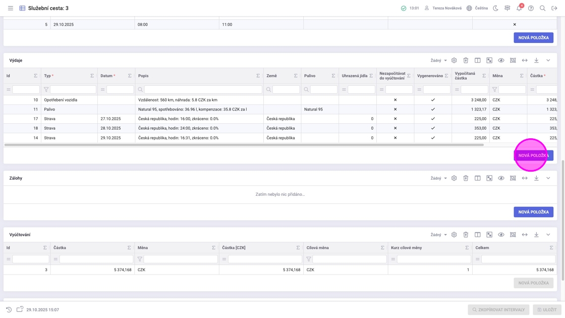 6. Na základě zadaných záznamů se automaticky vygenerovaly výdaje a vyúčtování. Nevygeneroval se ale např. výdaj za ubytování, který je třeba přidat ručně.
