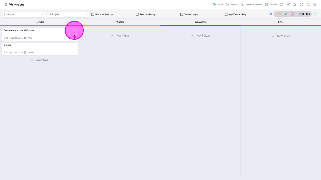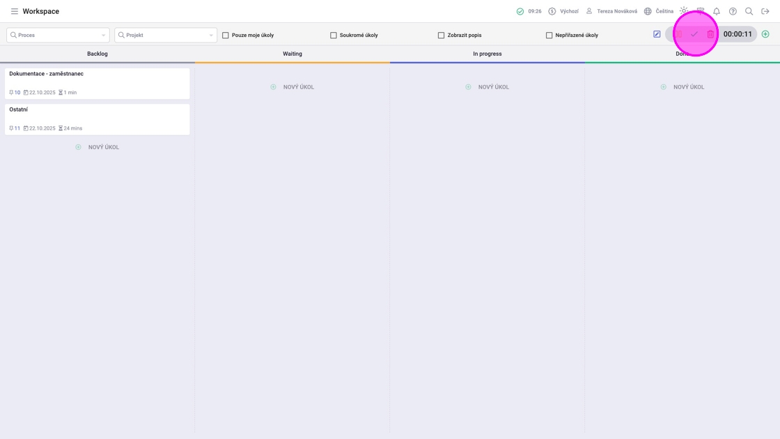6. Pro ukončení časomíry a zaznamenání záznamu práce kliknout na ikonu fajfky na položce, pro kterou byla časomíra spuštěna nebo na stejnou ikonu v pravém horním rohu.