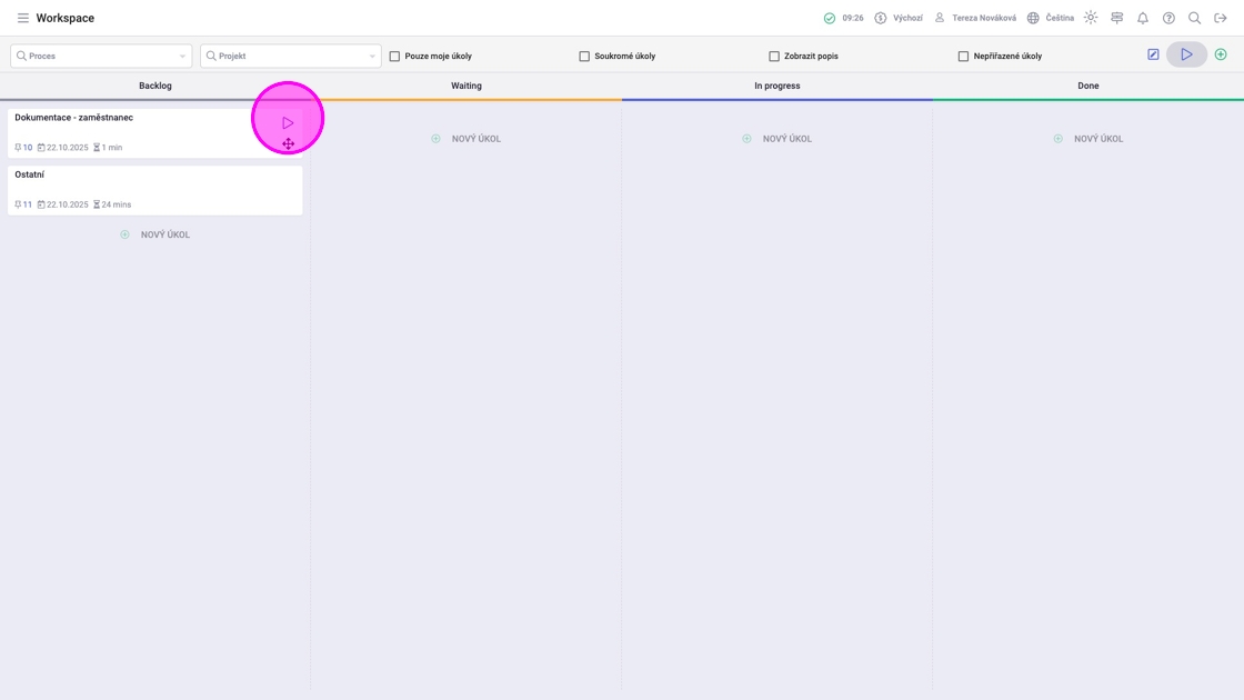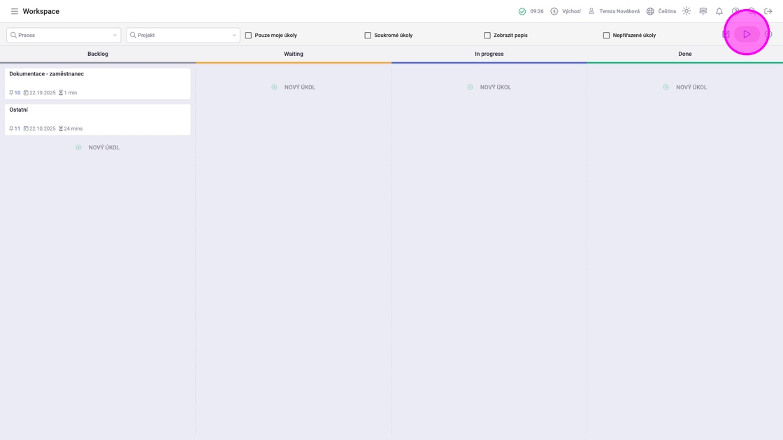 5. Pro spuštění časomíry pro konkrétní úkol kliknout na ikonu spustit, která se zobrazí po najetí na položku.