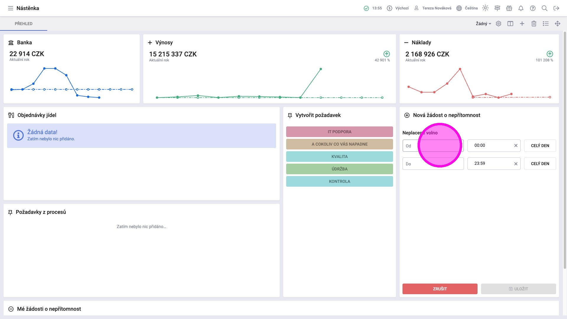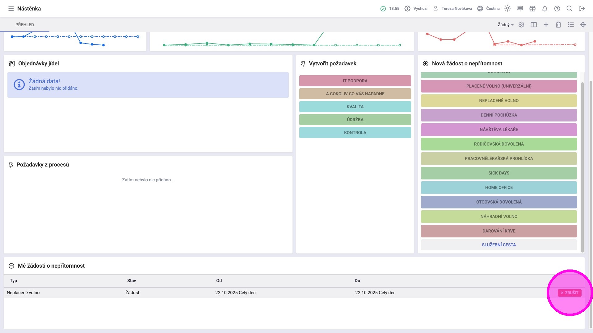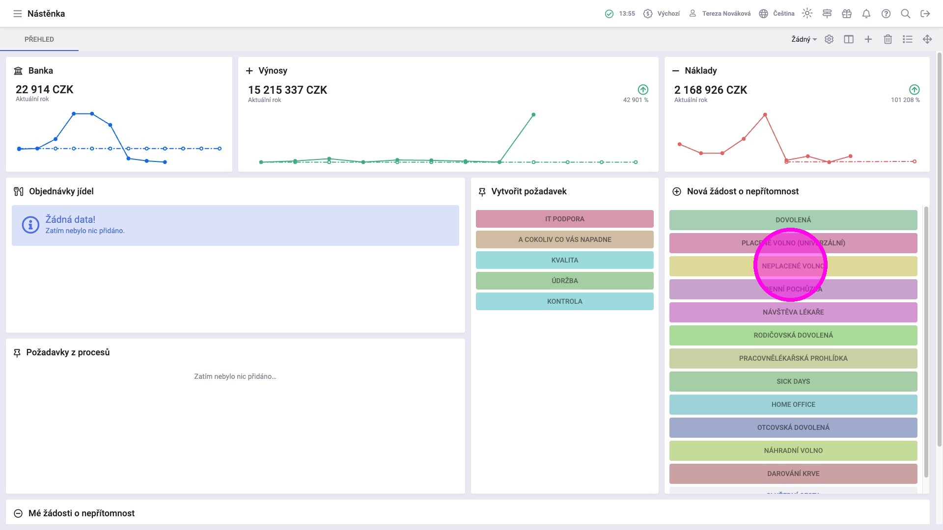 Žádosti o nepřítomnost lze podávat prostřednictvím widgetu Vytvořit požadavek. Zaměstnanci zde mohou žádat o volno například z důvodu návštěvy lékaře, dovolené nebo služební cesty. Ve widgetu Mé žádosti o nepřítomnost mají k dispozici kompletní seznam odeslaných požadavků, včetně jejich aktuálního stavu a zároveň mohou zadaný požadavek zrušit, pokud je to potřeba.
