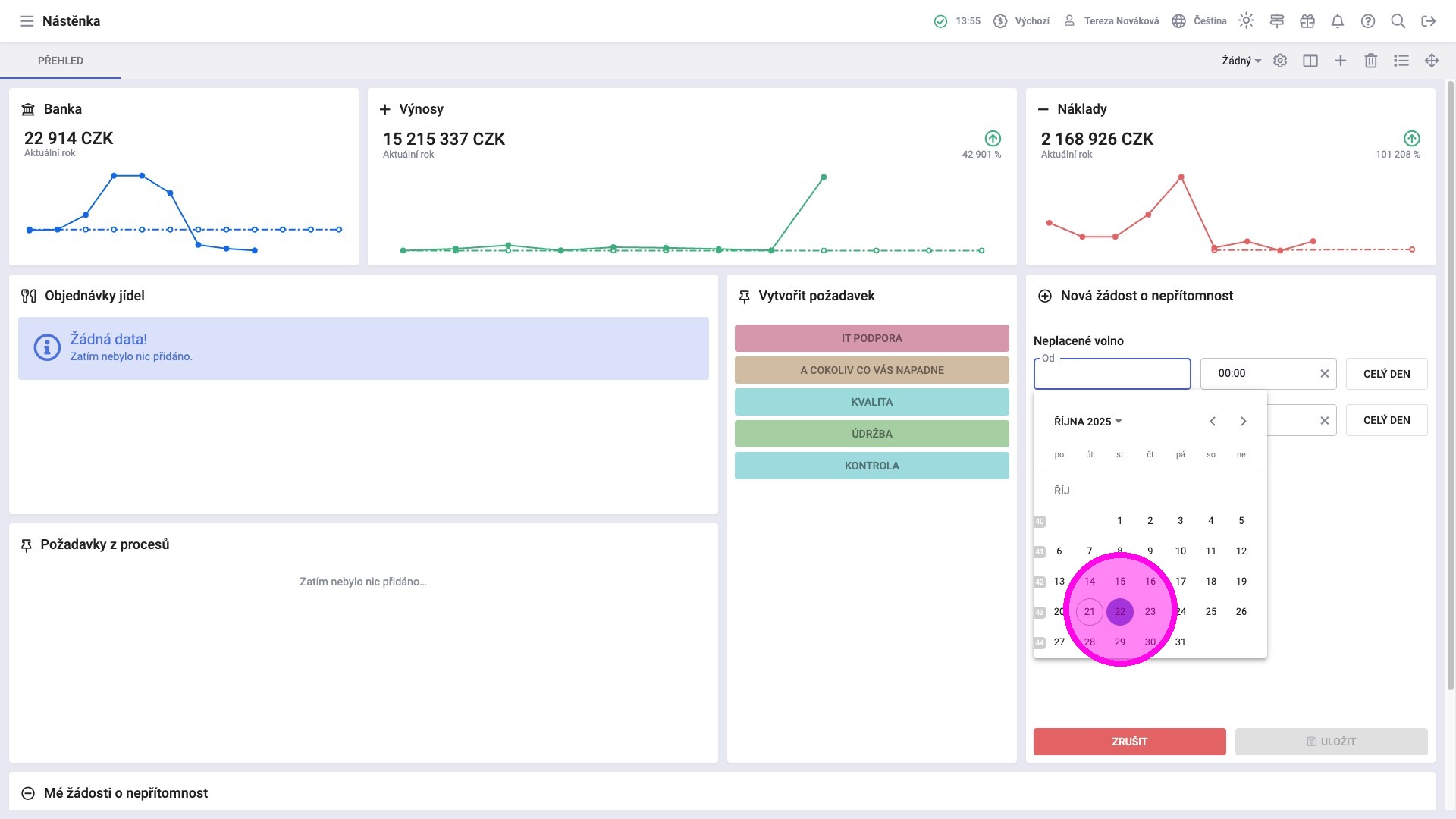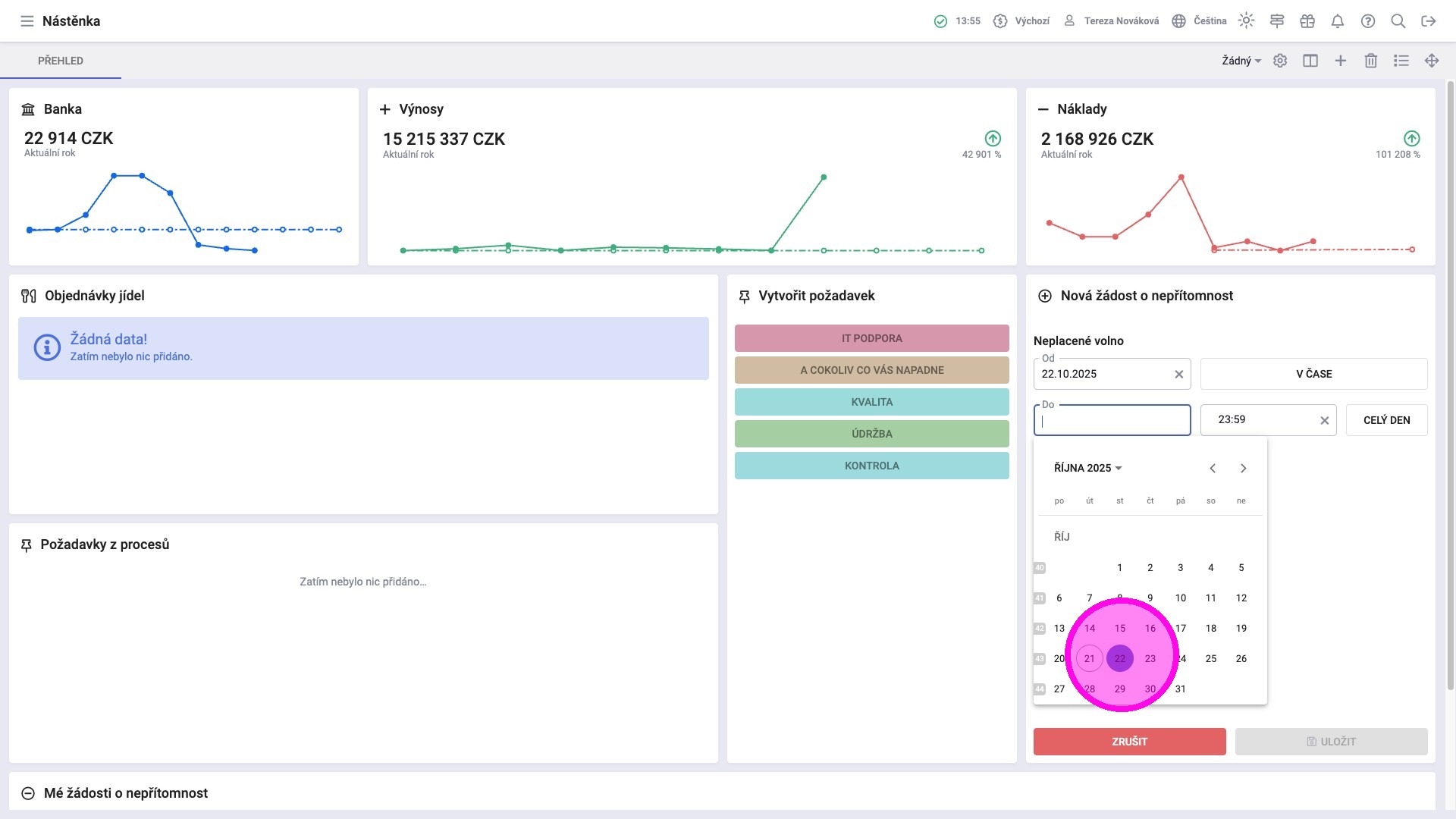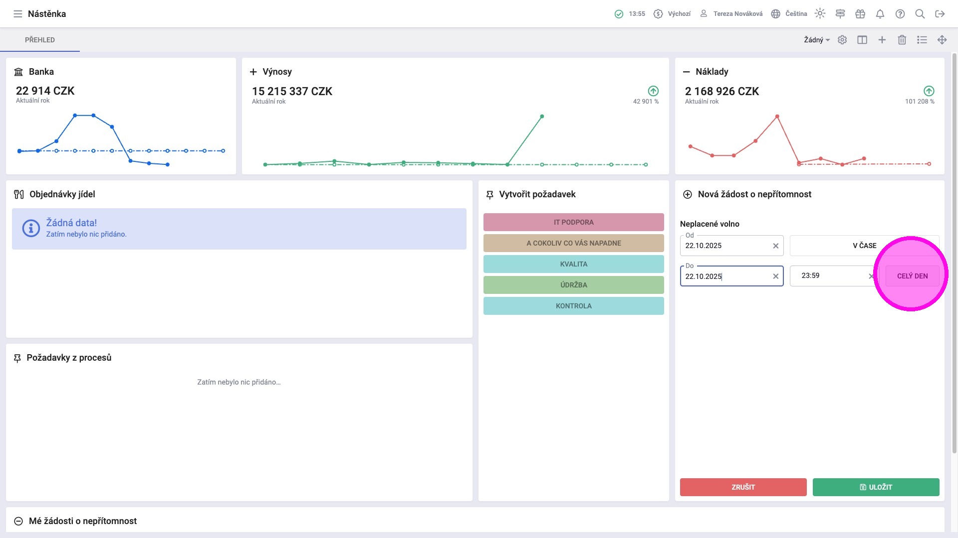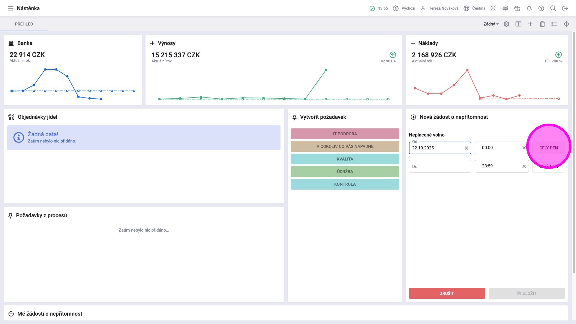 Žádosti o nepřítomnost lze podávat prostřednictvím widgetu Vytvořit požadavek. Zaměstnanci zde mohou žádat o volno například z důvodu návštěvy lékaře, dovolené nebo služební cesty. Ve widgetu Mé žádosti o nepřítomnost mají k dispozici kompletní seznam odeslaných požadavků, včetně jejich aktuálního stavu a zároveň mohou zadaný požadavek zrušit, pokud je to potřeba.