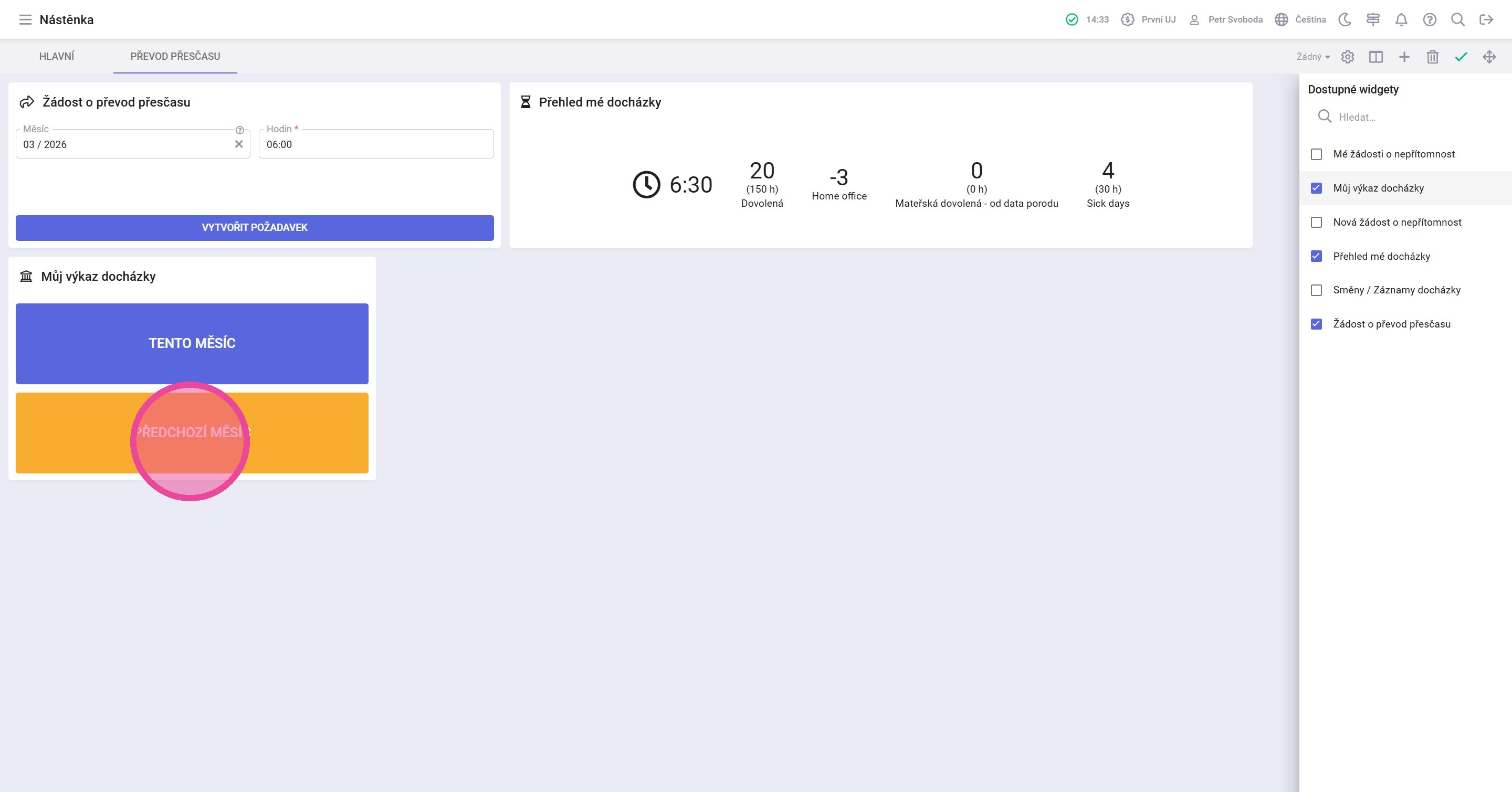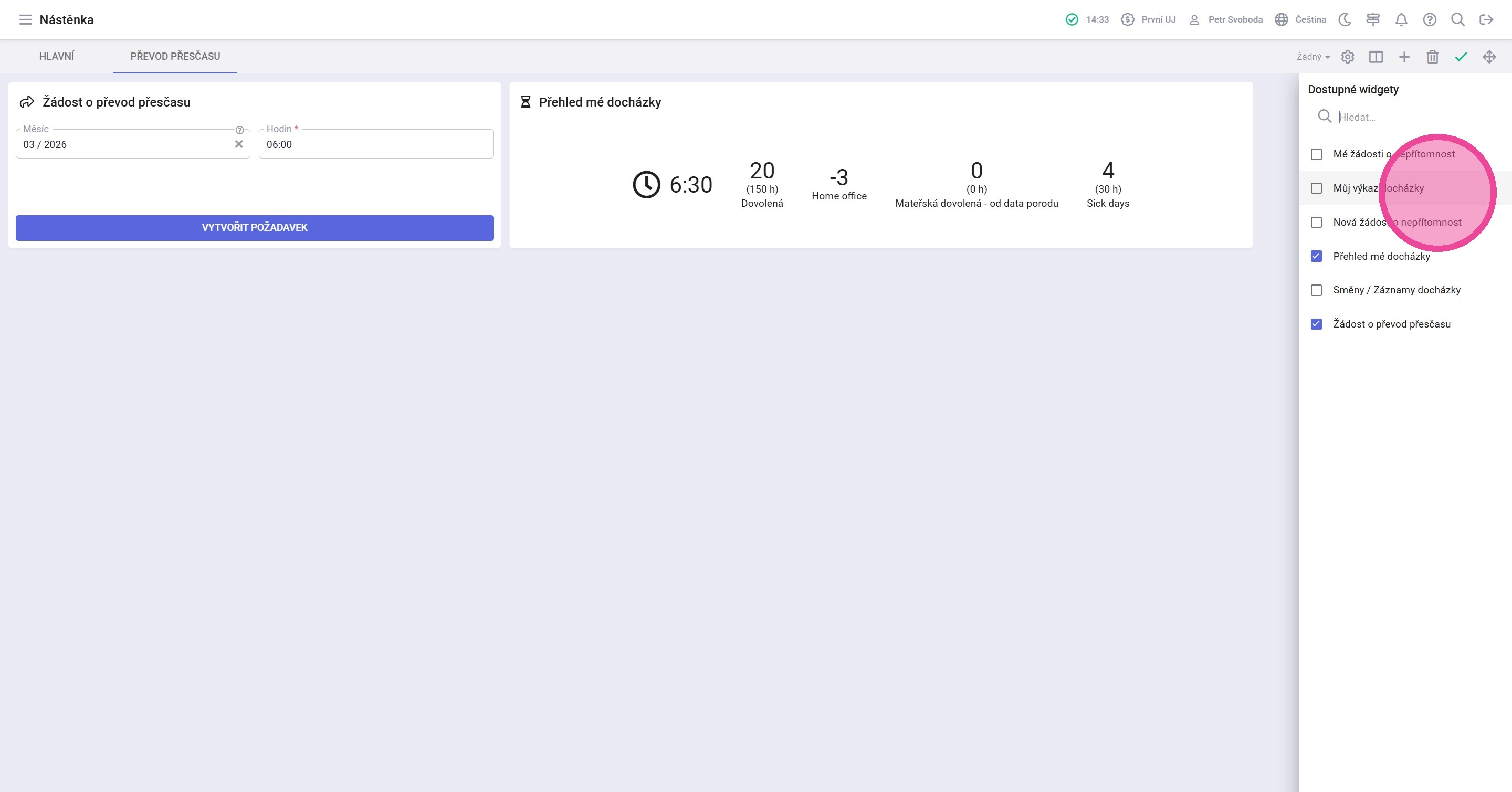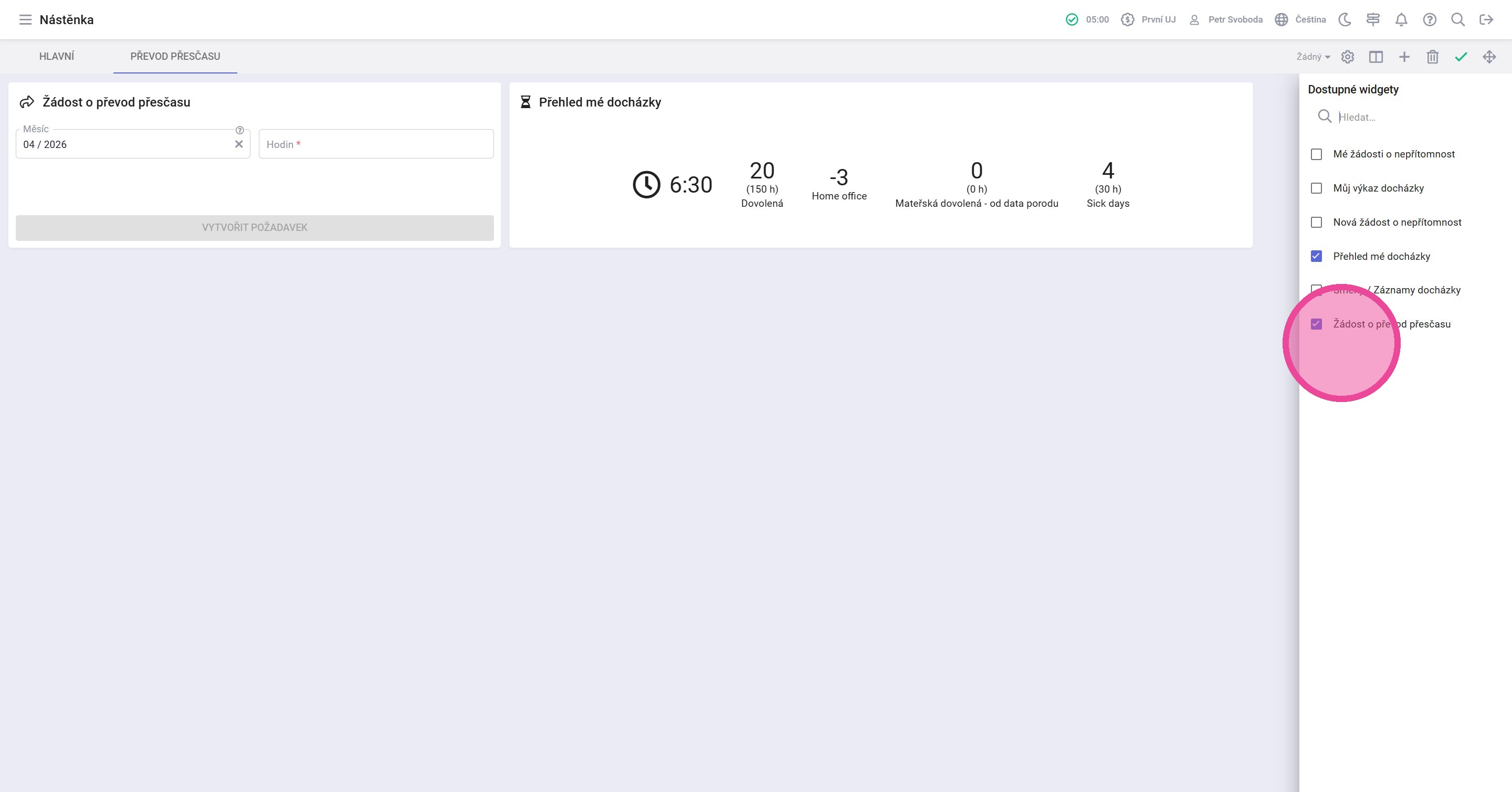 1. Na nástěnce přidat widget Žádost o převod přesčasu.
