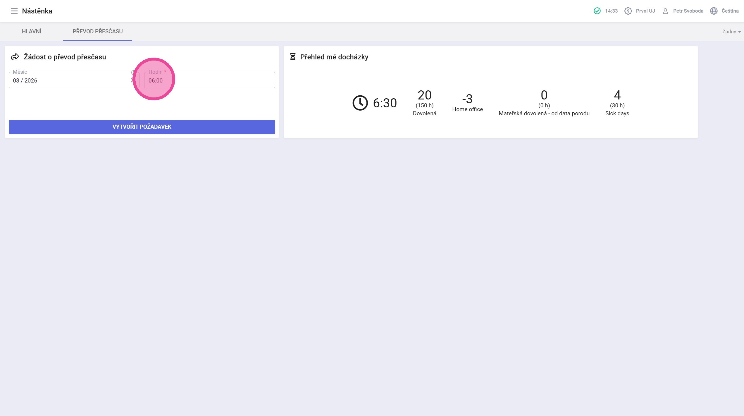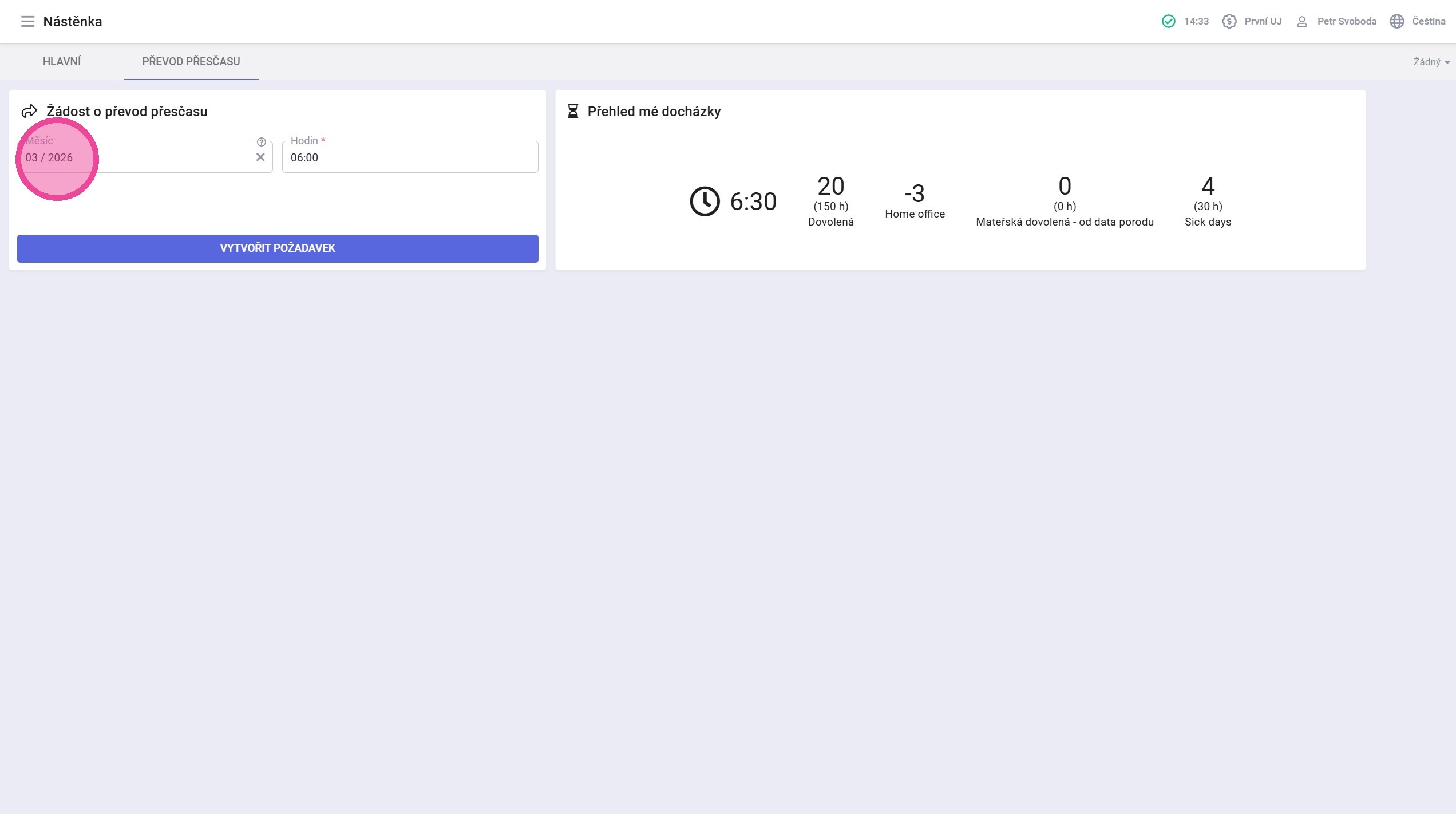 4. Pokud chcete vytvořit žádost o převod přesčasu a widget Přehled mé docházky již nezobrazuje počet přesčasových hodin za uplynulý měsíc, protože žádost vytváříte jindy než první den v měsíci, můžete počet přesčasových hodin zjistit ve svém Výkazu docházky.