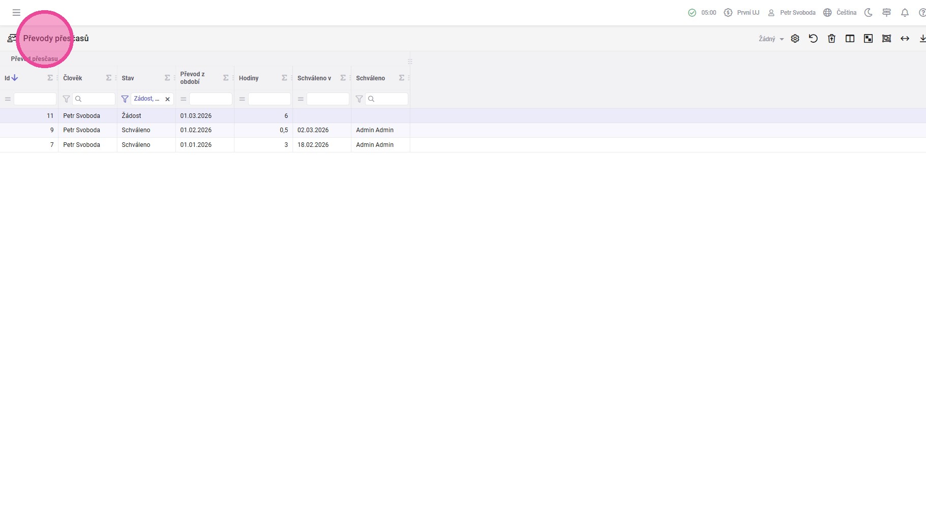 7. V agendě Převody přesčasů naleznete přehled všech vytvořených žádostí o převod přesčasu - včetně schválených a zamítnutých.