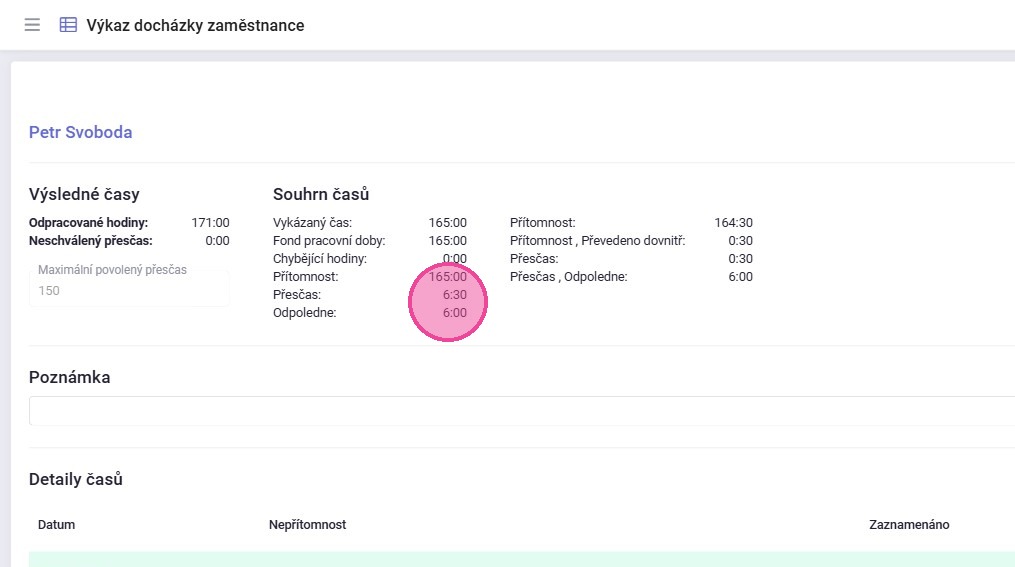 6. Výši přesčasů naleznete v sekci Souhrn časů.